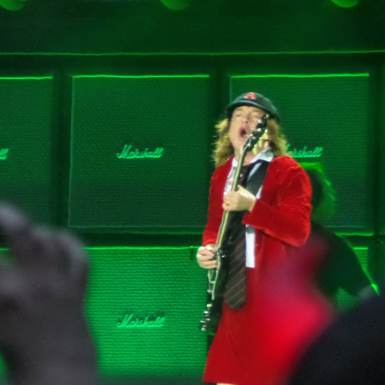 Définitivement, Angus Young est encore plein d’énergie avec son éternel costume d’écolier, en velours rouge cette fois, sa casquette et sa cravate. Il arpente la scène, en long et en large, déchainé, son duck walk toujours aussi parfait, tout en exécutant ses riffs de guitare Gibson abrasives et envoûtants. Il sautille, grimasse, s’amuse et communique non-stop avec le public chauffé au maximum, et en fin, il se retrouve avec un genou écorché.