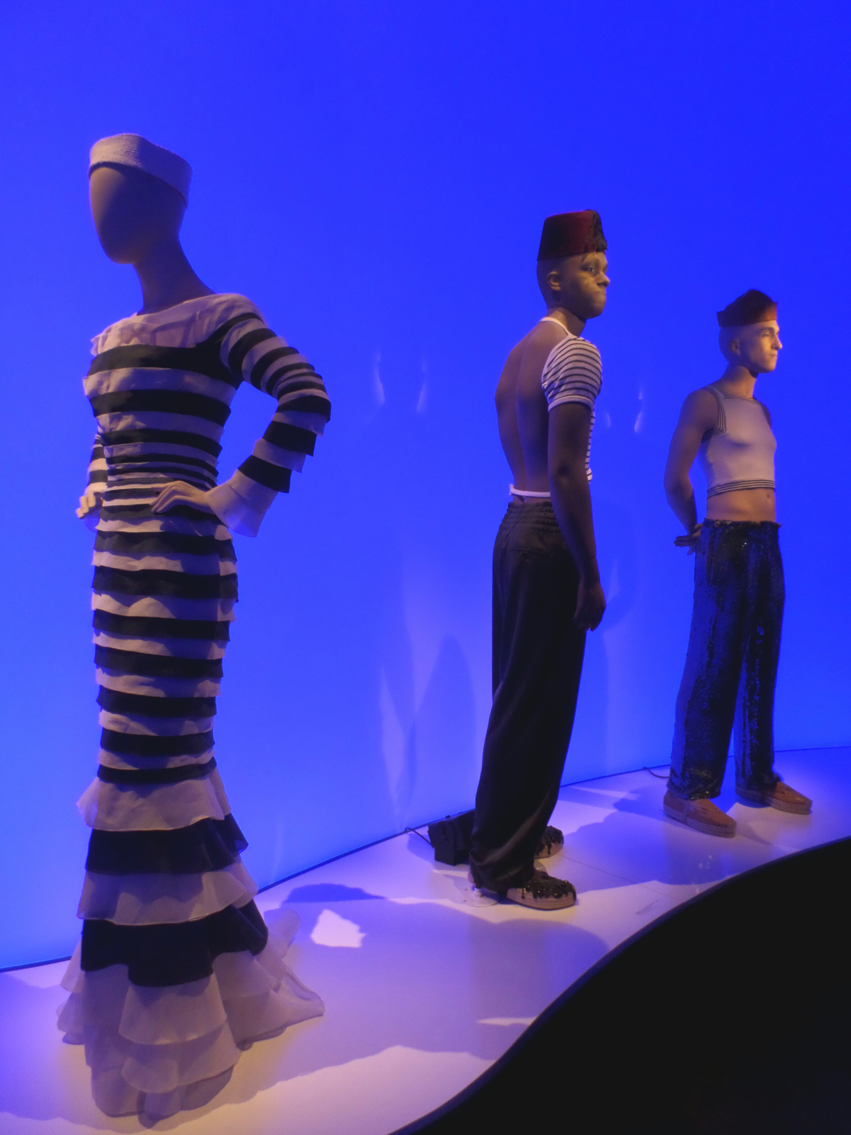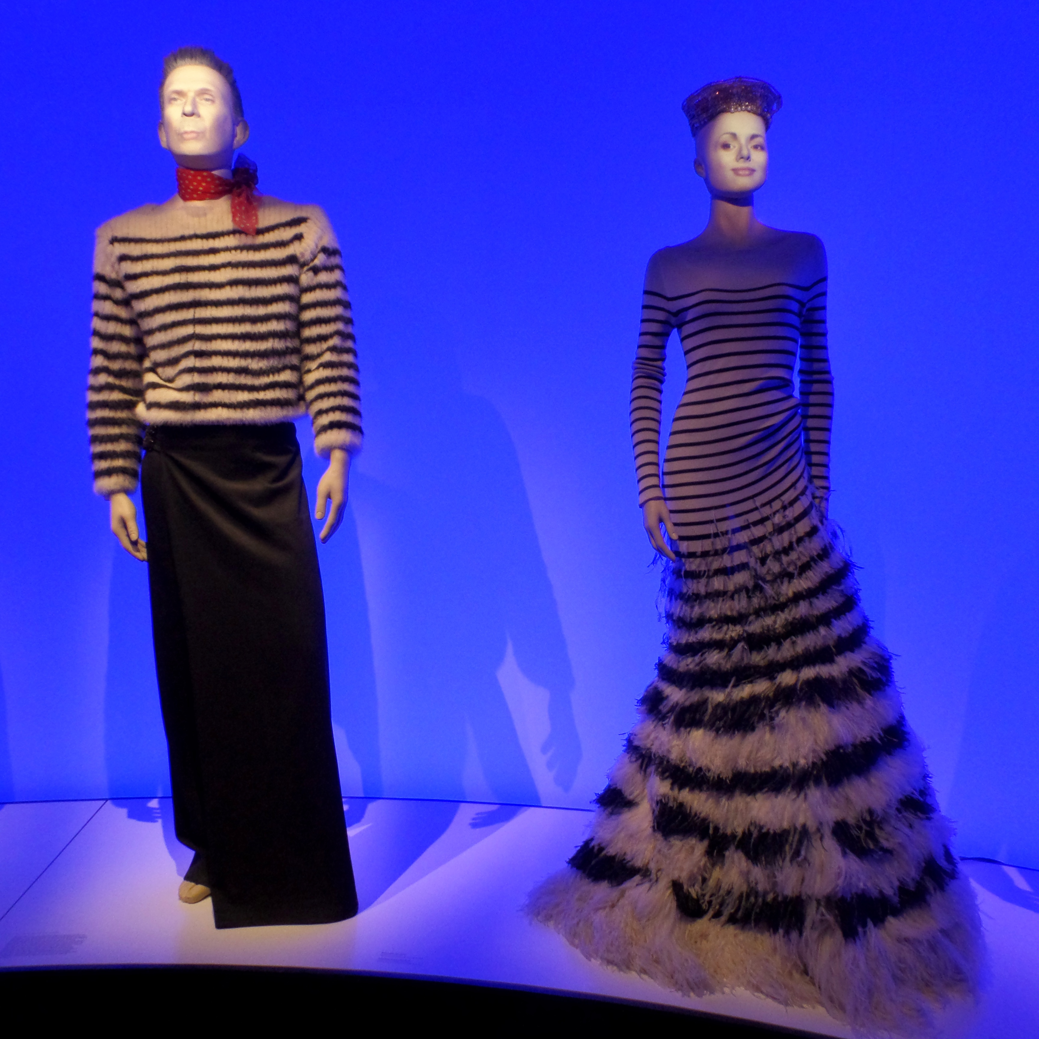 Ses emblèmes chers à son cœur – la marinière –qu’il a détourné et décliné dans tous ces collections en faisant un indispensable- le corset, le soutien-gorge conique – sont présentés dans plusieurs matières.