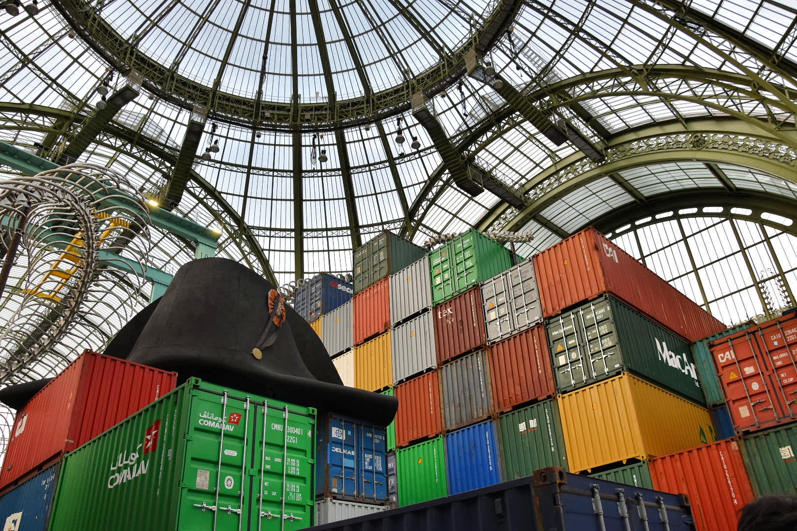 L’artiste chinois a créé une installation spectaculaire, composée de huit collines de conteneurs colorés, un serpent de métallique argenté soutenu par une grue et un chapeau bicorne posé sur une arche, inspiré de celui porté par Napoléon à la bataille de Elyau.