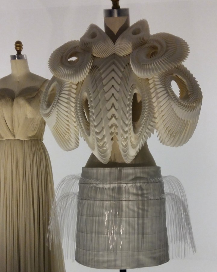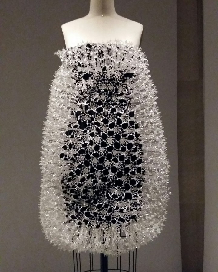The display covers all fashion métiers : pleating, lacework, leatherwork, embroideries with gems, feathers, pearls or flowers…remarkable art pieces hand made, made with innovating technologies or both.