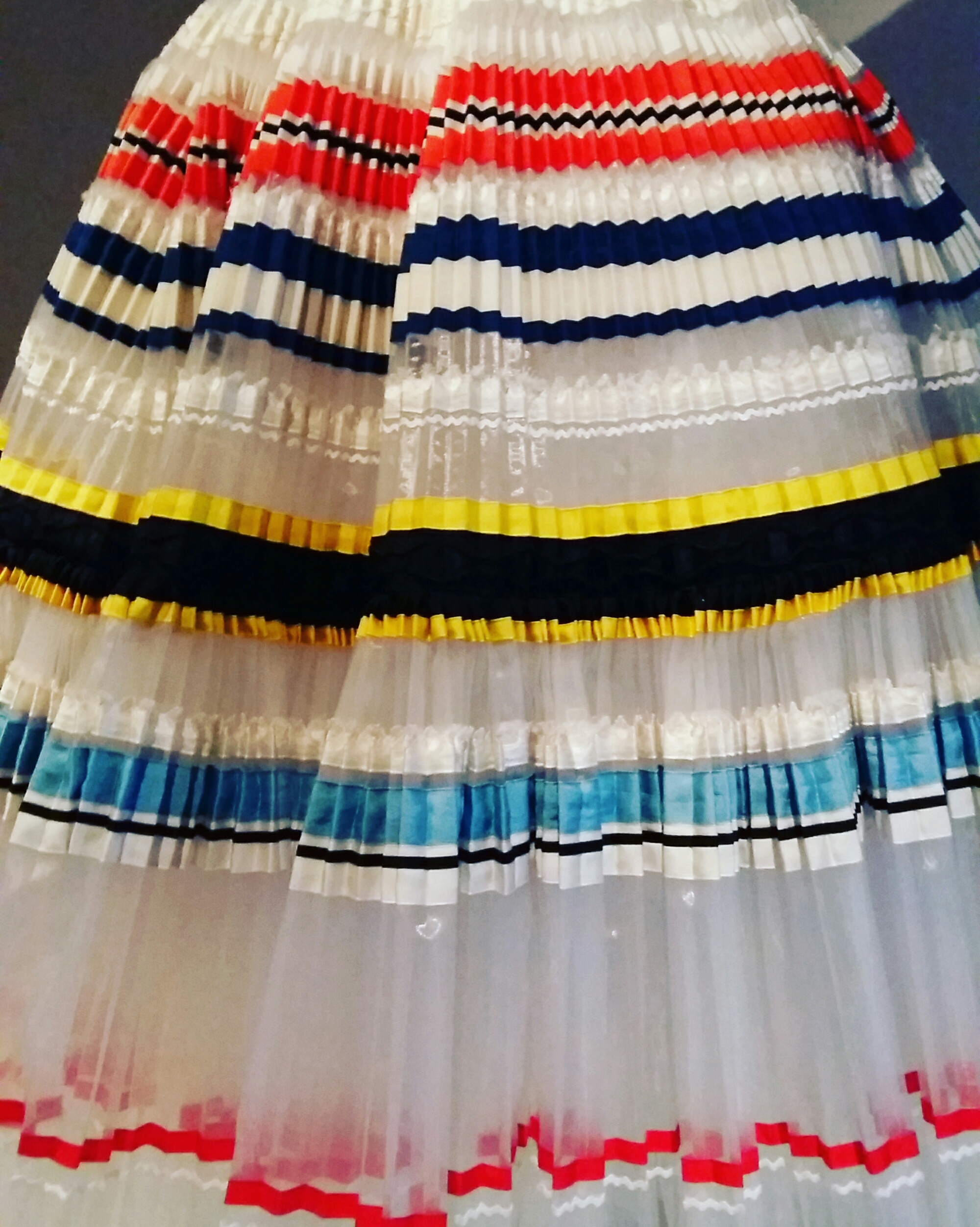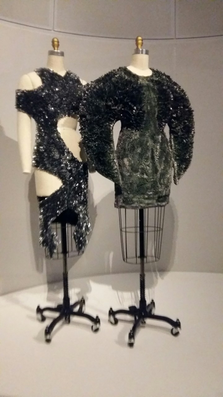 L’exposition regroupe tous les métiers de la mode : le plissé, la dantele, le travail du cuir, la broderie avec des sequins, pierres ou plumes, des fleurs… de pièces représentatives fait main, avec des technologies innovantes ou mixtes.