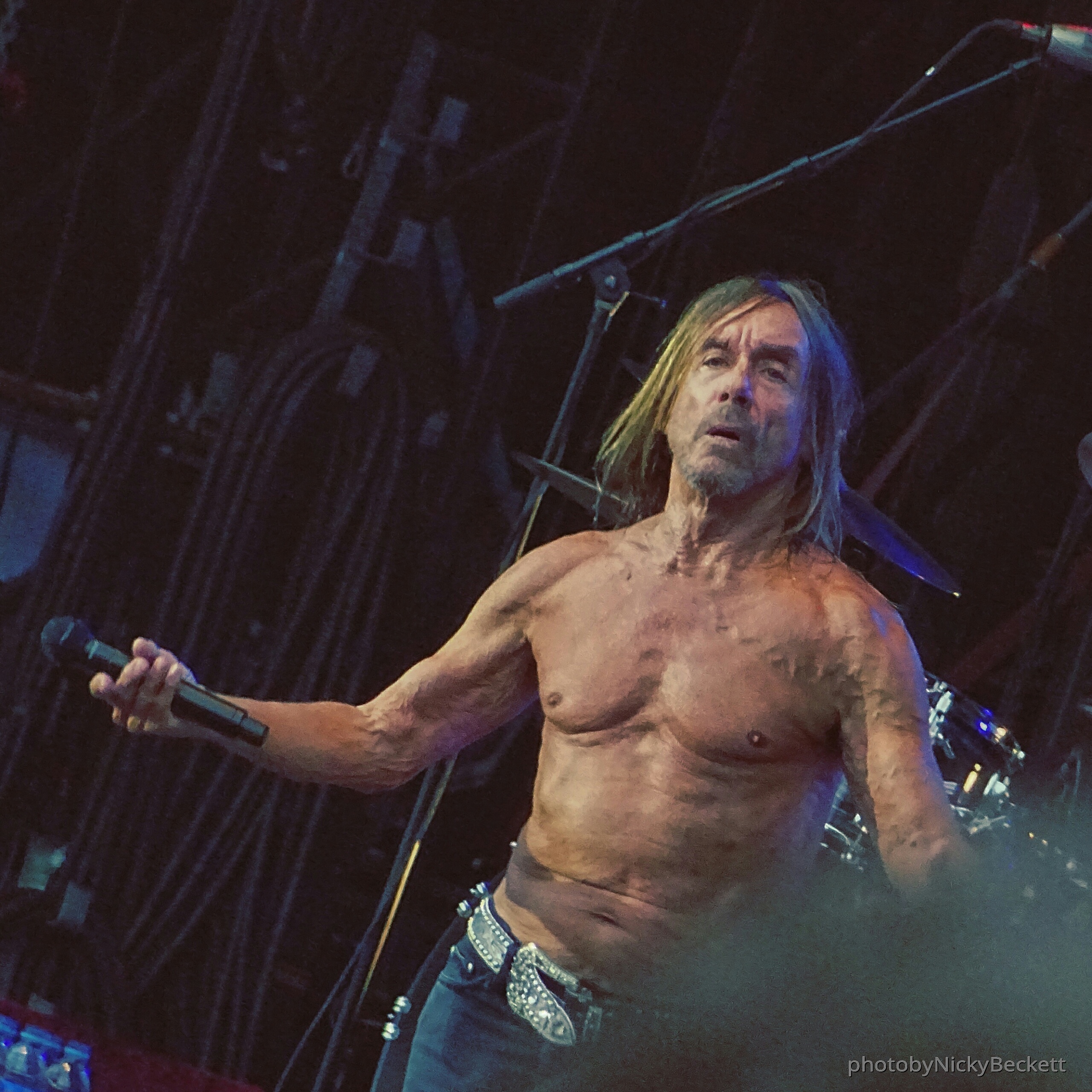 Iggy Pop, monstre sacré en uniforme habituelle slim, torse nu et grosse ceinture est au top de sa forme. Son show : un best of… A peine arrivé sur scène en sautillant comme un gamin, il attaque avec un explosive I wanna be Your Dog, suivi de Passangers et Lust for Life. Le public est en délire.
