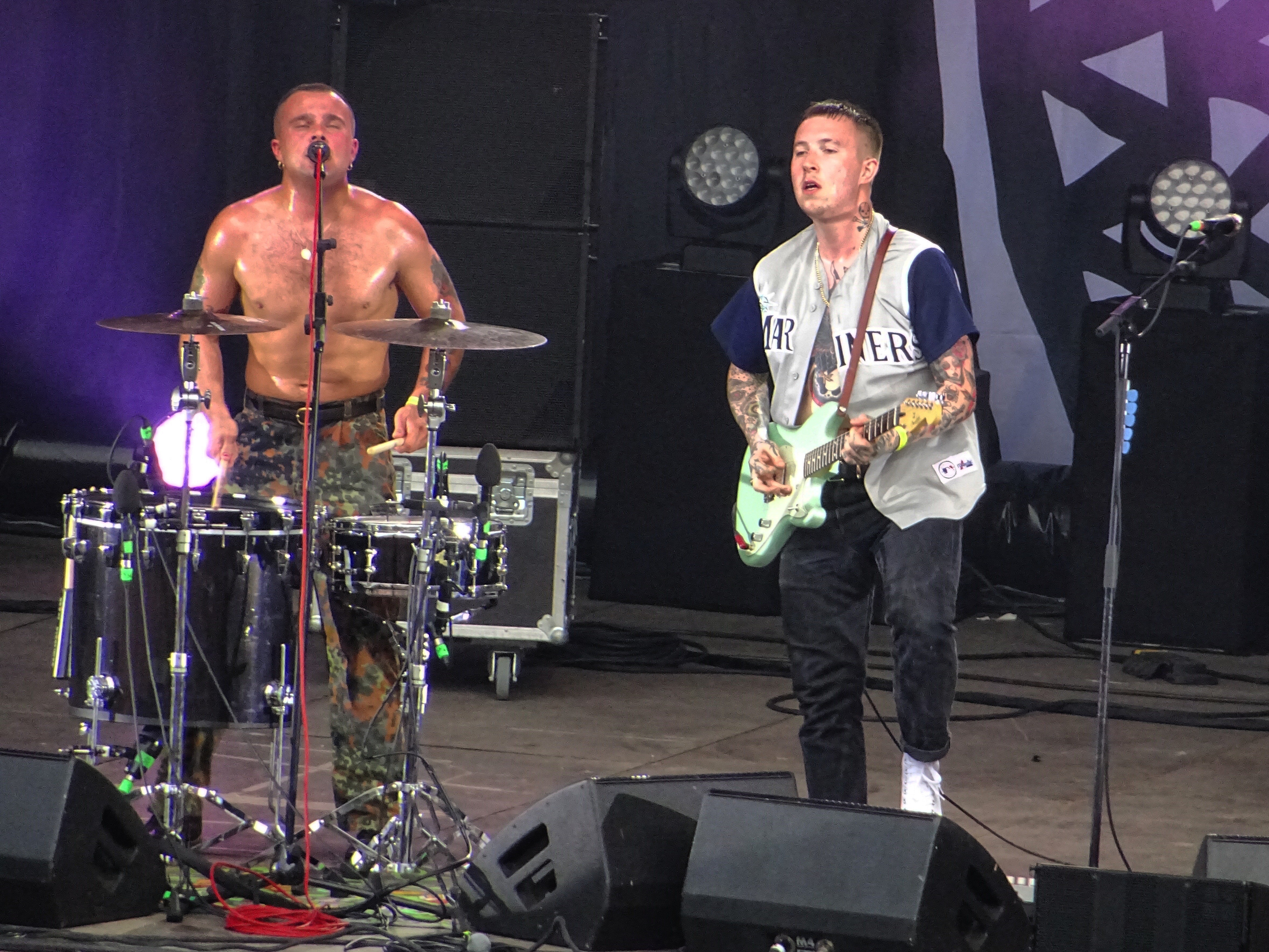 Slaves, l’excellent duo punk rock britannique qui monte. Son rugueux, bruyant, avec des accents hip hop, paroles engagées. Le chanteur batteur Isaac Holman et Laurie Vincent, guitariste tatoué de tête aux pieds ont fait un show ultra puissant et rebel. Leur deuxième album Total Control sortira fin septembre et je vous en parlerai bientôt.