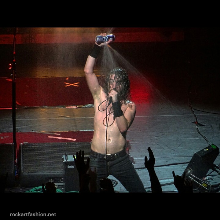 The singer, shirtless, is sweating so much that a mediator left glued on his skin. The party’s is accompanied by beer and Jack + Coke cocktails. Joel distributes or rather throw glasses in the audience. Several times, he spilled beer cans over his head (yeah, it is well known that beer makes the hair soft and shiny, but I doubt very much that he was thinking about hair care…).