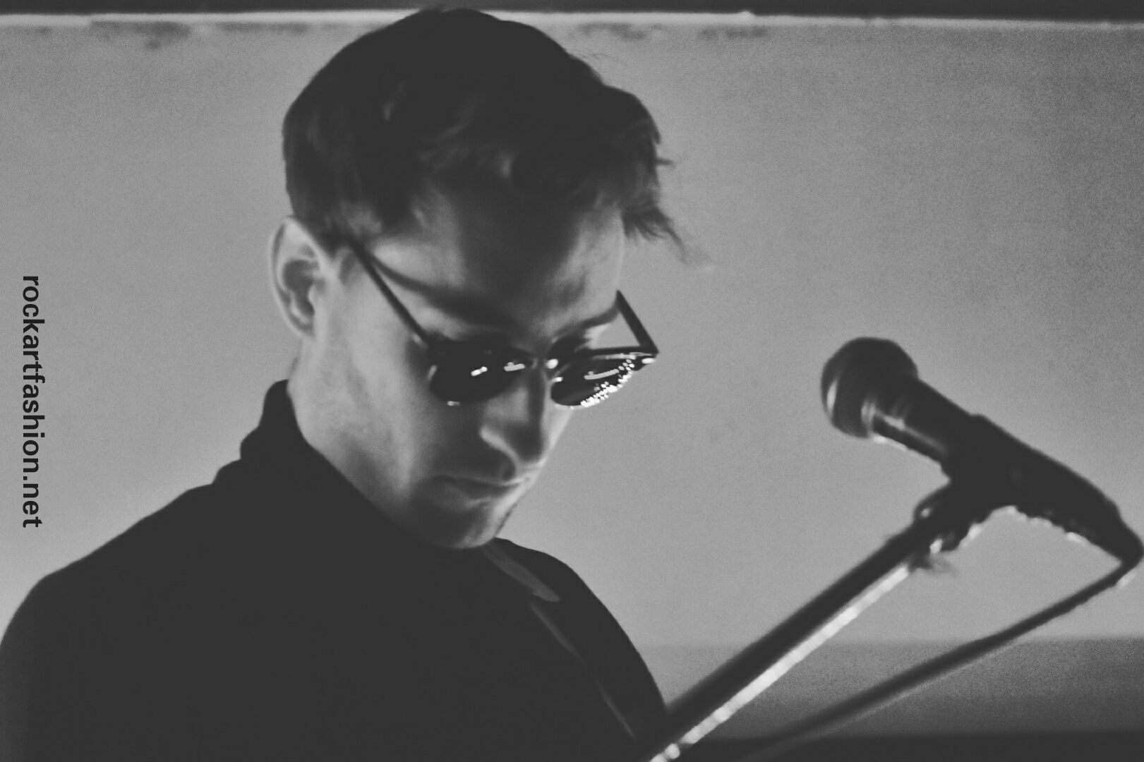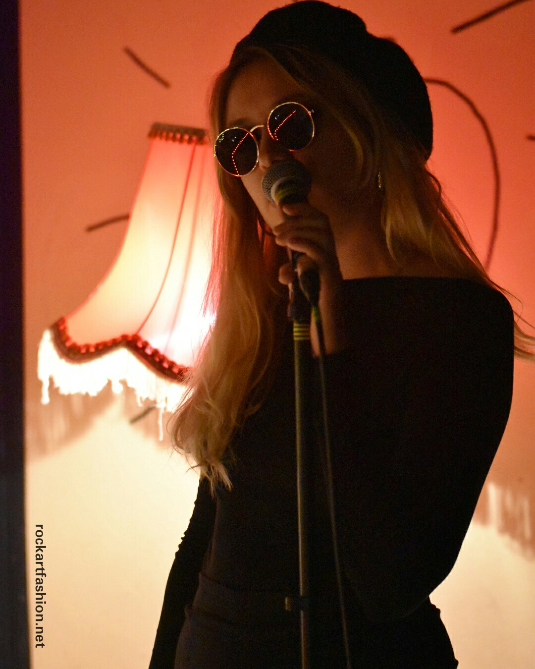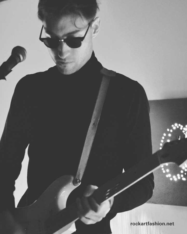 Julie, the singer, feline allure is wearing black- sweater and short, boots, berret and sunglasses, chic à la française, very Brigitte Bardot and Emilien, the guitarist and songwriter, look John Lennon, turtle neck and sunglasses.