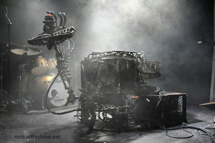 La petite scène est bien remplie avec au milieu, le Scorpion Tail, l’impressionnant drum électronique, doté d’un bras robotique, conçu et fait à la main par Daniel Oliver et qu’on dirait tout droit sorti d’Iron Man ou de Mad Max.