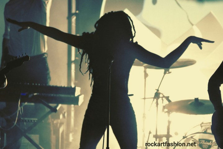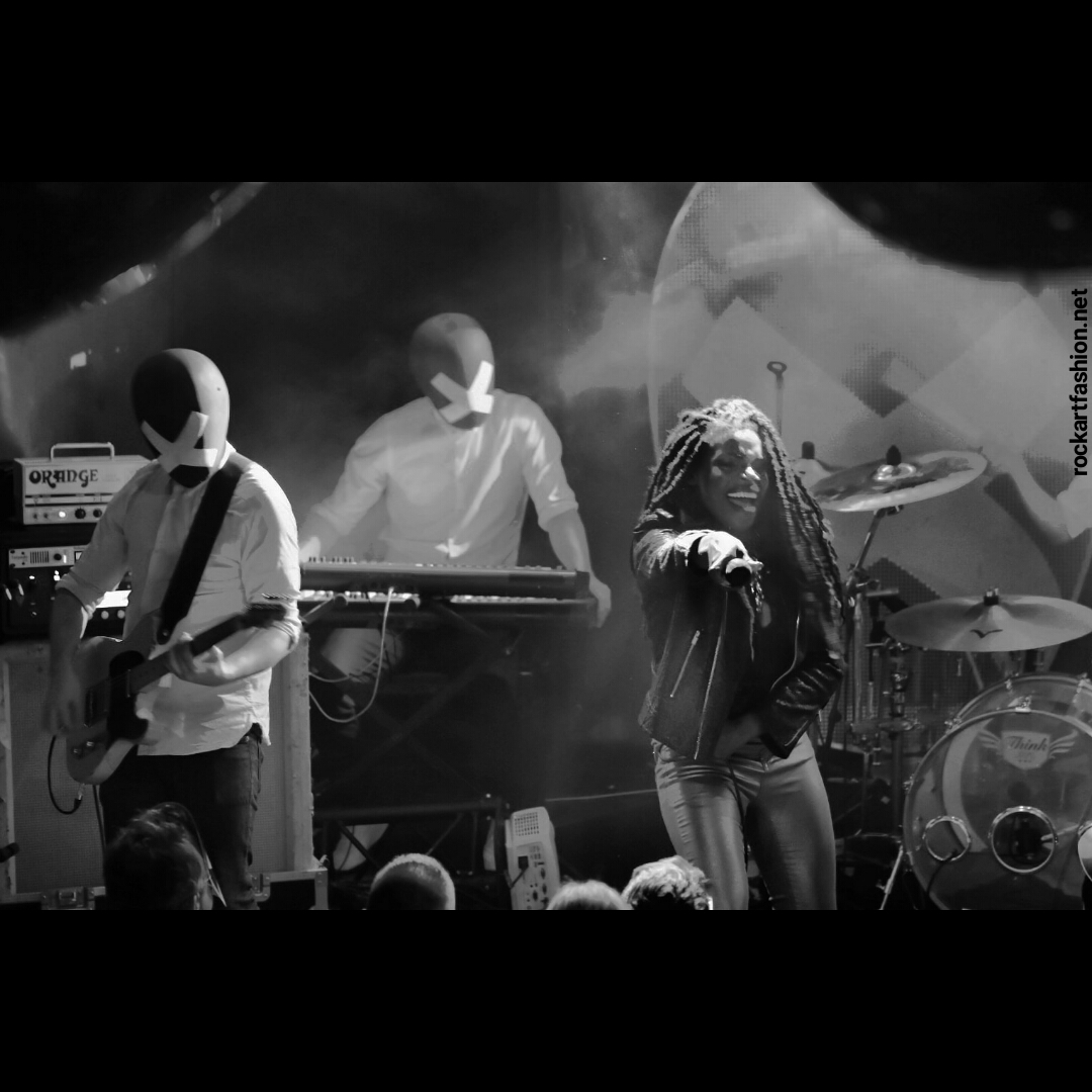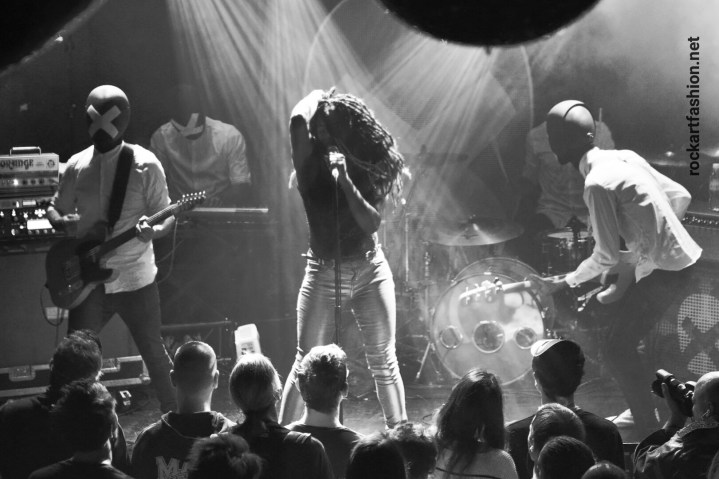 Longues dreadlocks, grand sourire, regard pétillant, Oma est magnifique. Habillée d’un pantalon argenté, joli perfecto noir, boots et grand collier, c’est elle, qui tient la vedette. Le jeu de scène, la complicité avec les 4 garçons masqués, qui portent de chemises blanches et pantalons noirs, est très réussi.