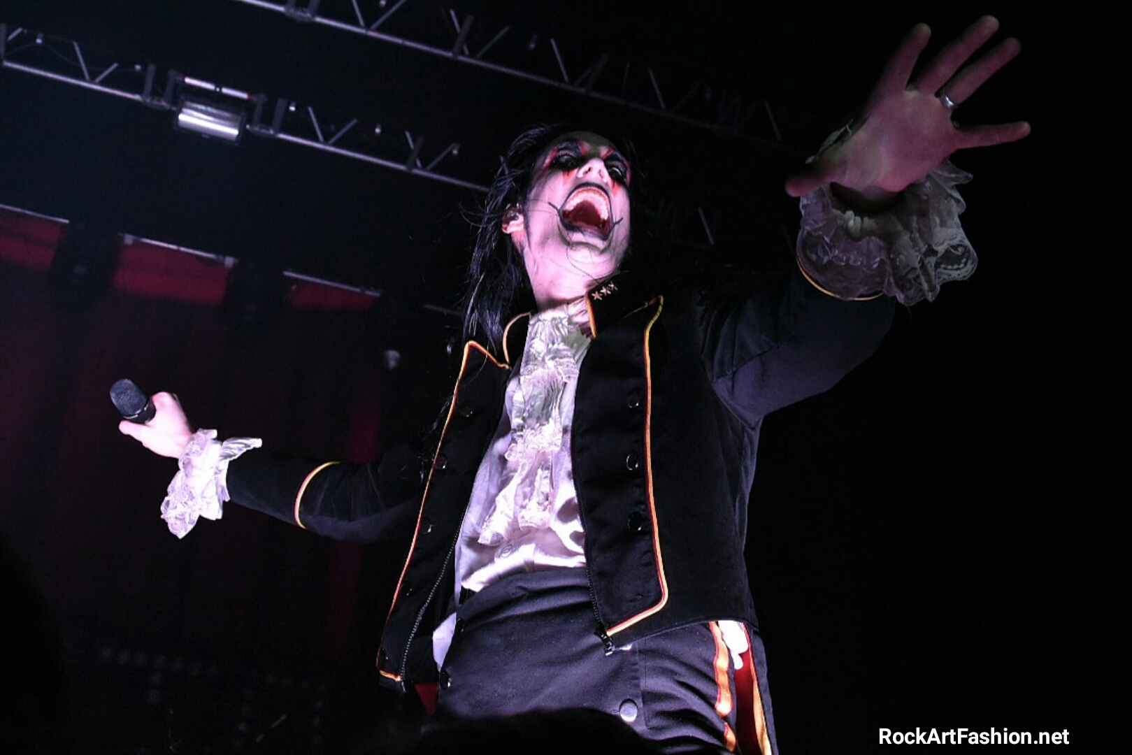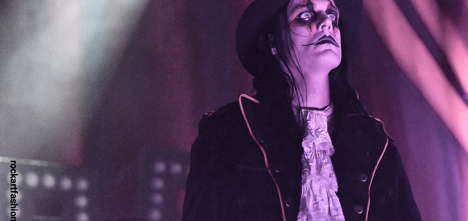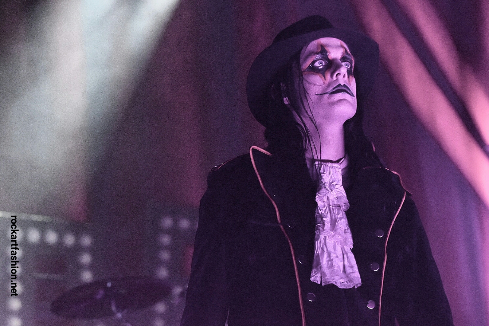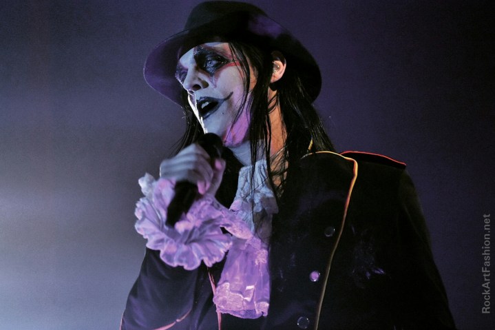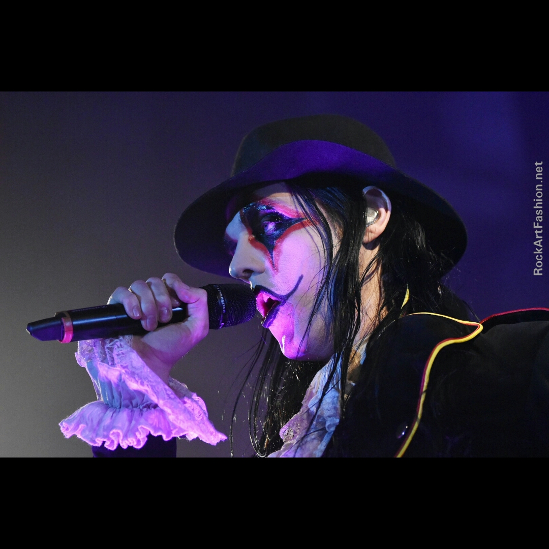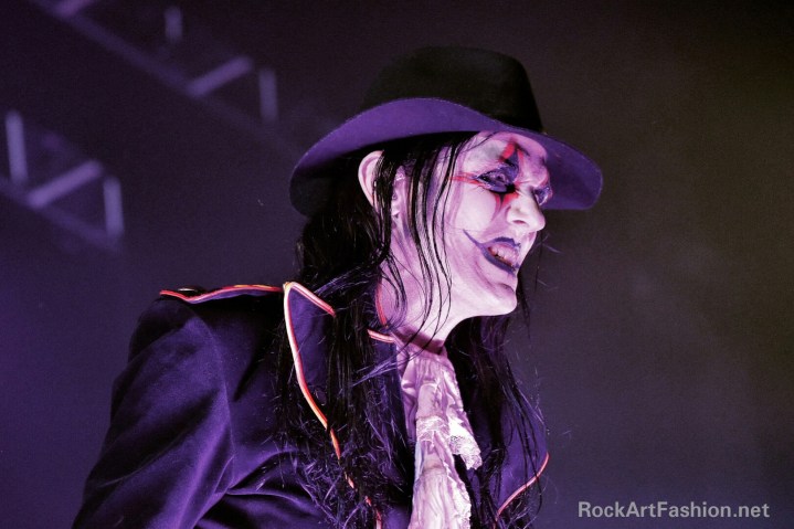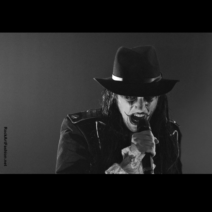 Fou de scène, visage peint façon Kiss, Alice Cooper croisés avec le Joker du Batman, il enchaîne les mimiques théâtrales et clownesques.