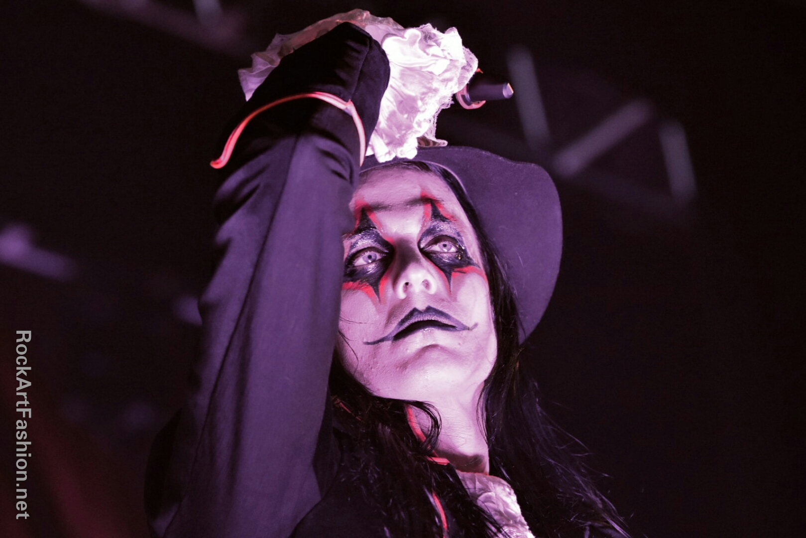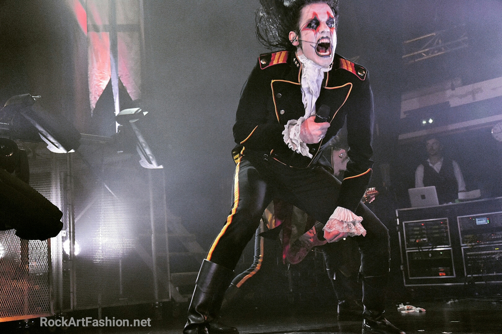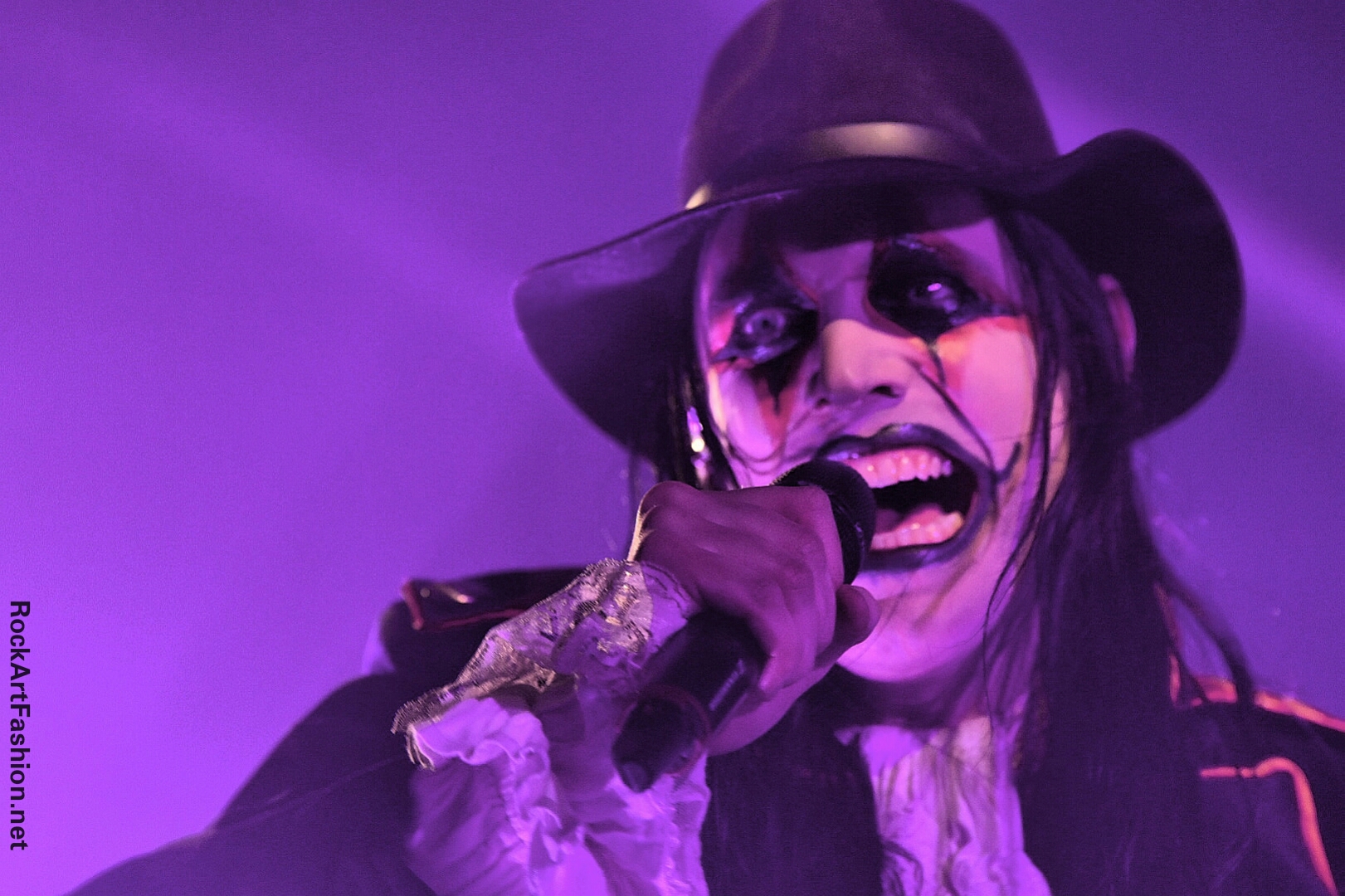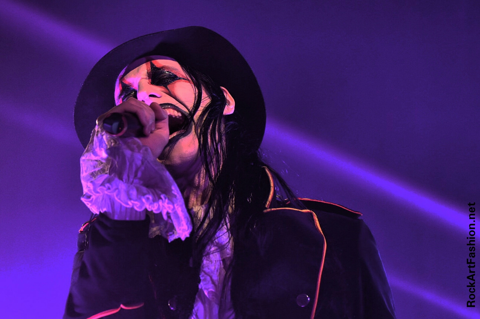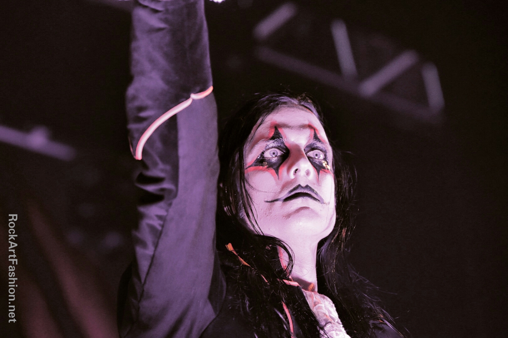 Fou de scène, visage peint façon Kiss, Alice Cooper croisés avec le Joker du Batman, il enchaîne les mimiques théâtrales et clownesques.
