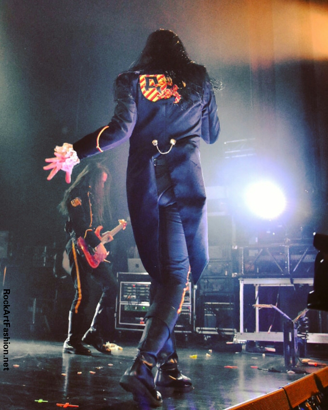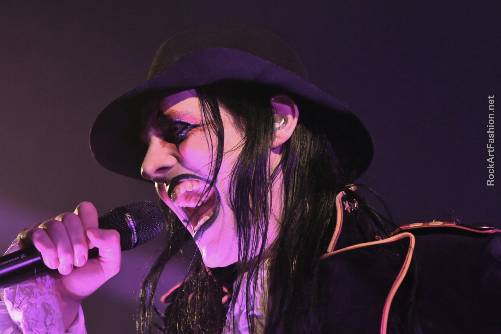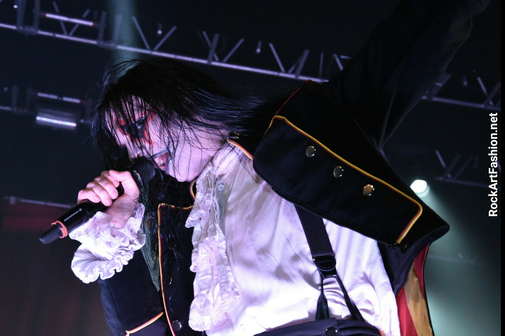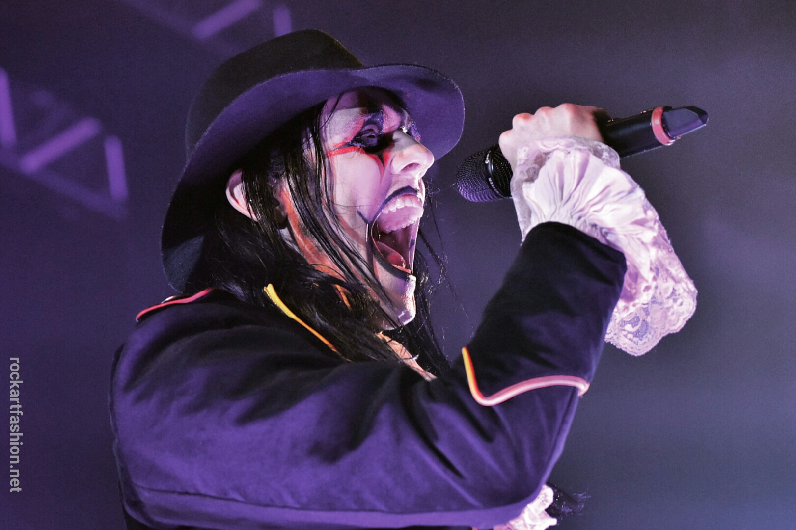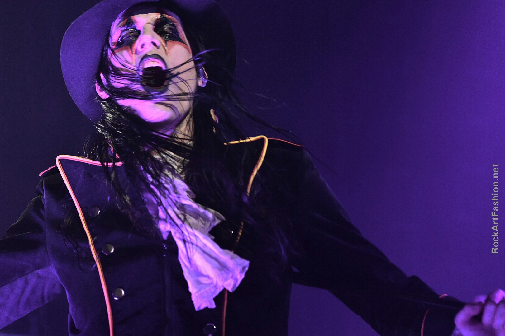 Fou de scène, visage peint façon Kiss, Alice Cooper croisés avec le Joker du Batman, il enchaîne les mimiques théâtrales et clownesques.