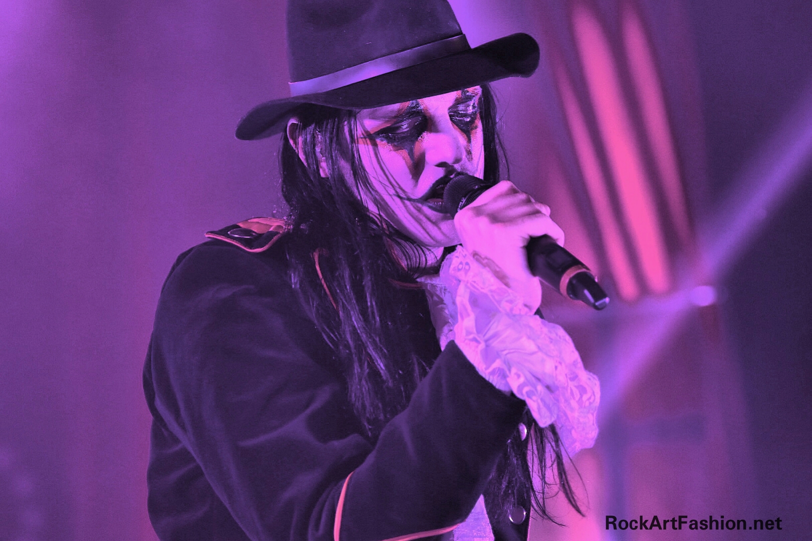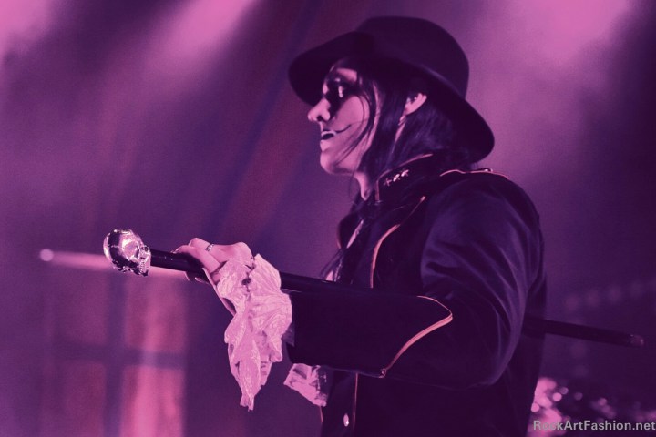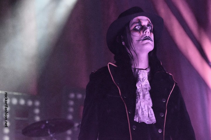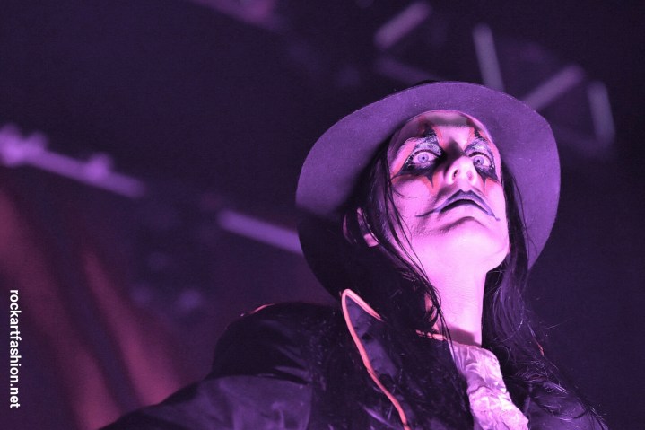 Johannes Eckerström, tall and thin, the immensely charismatic frontman is wearing hat, skull walking stick, an elegant medieval frock coat and ascot lace blouse. His face is awesomely painted with a mix between Kiss, Alice Cooper and the Joker of Batman.