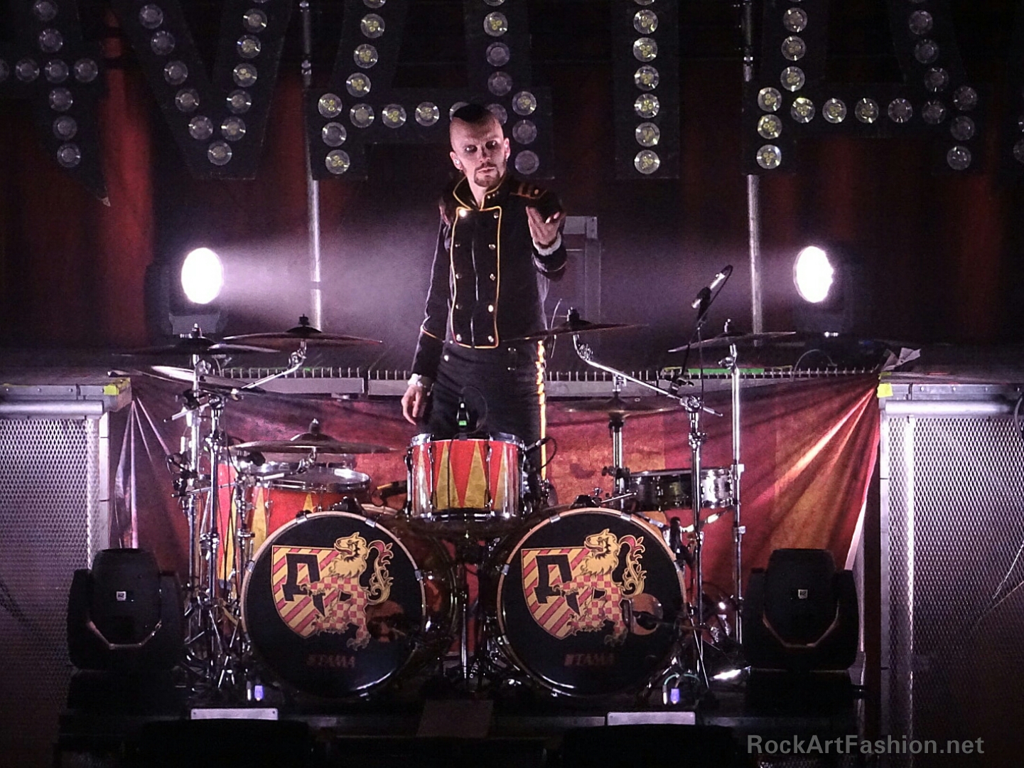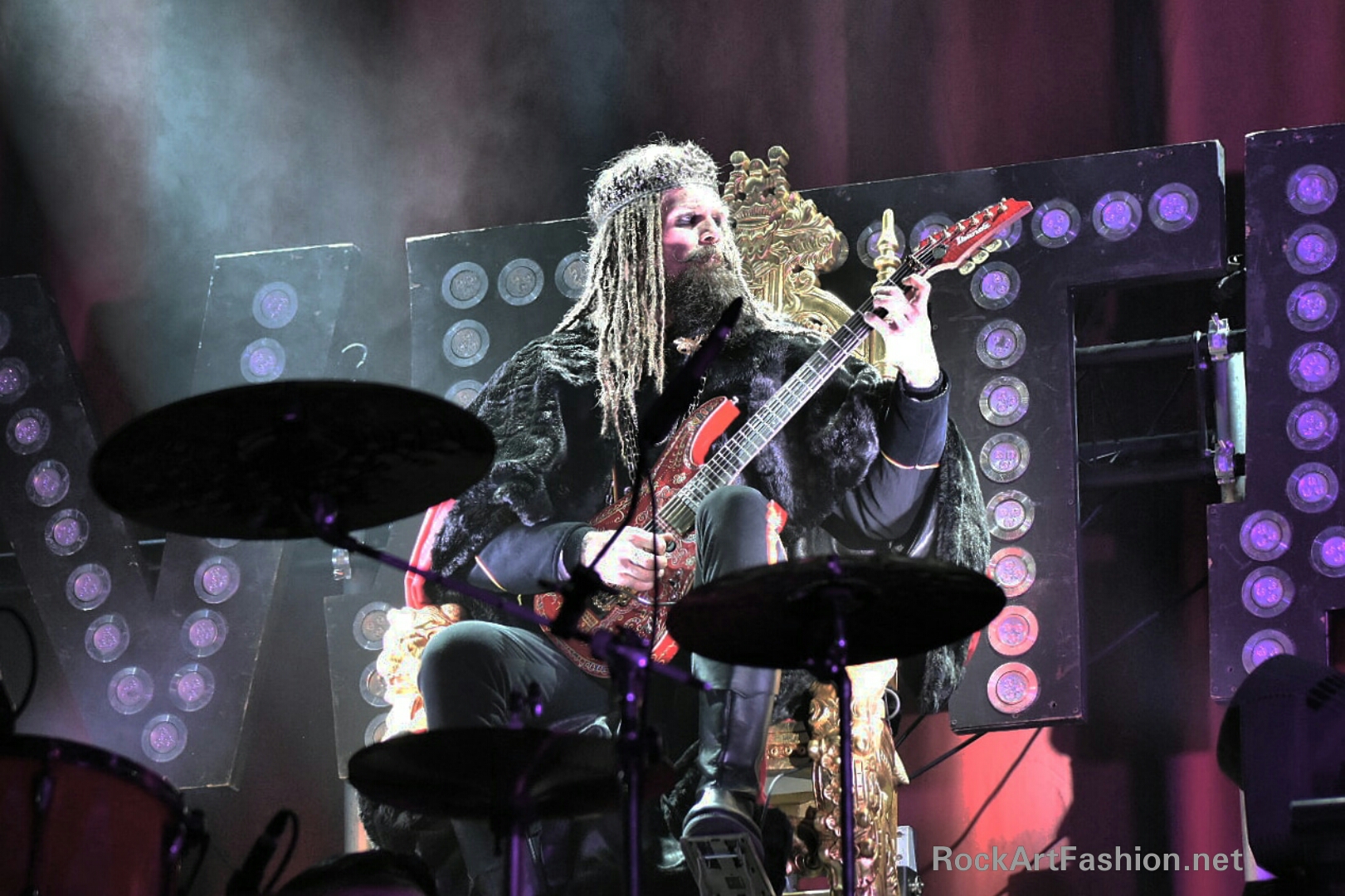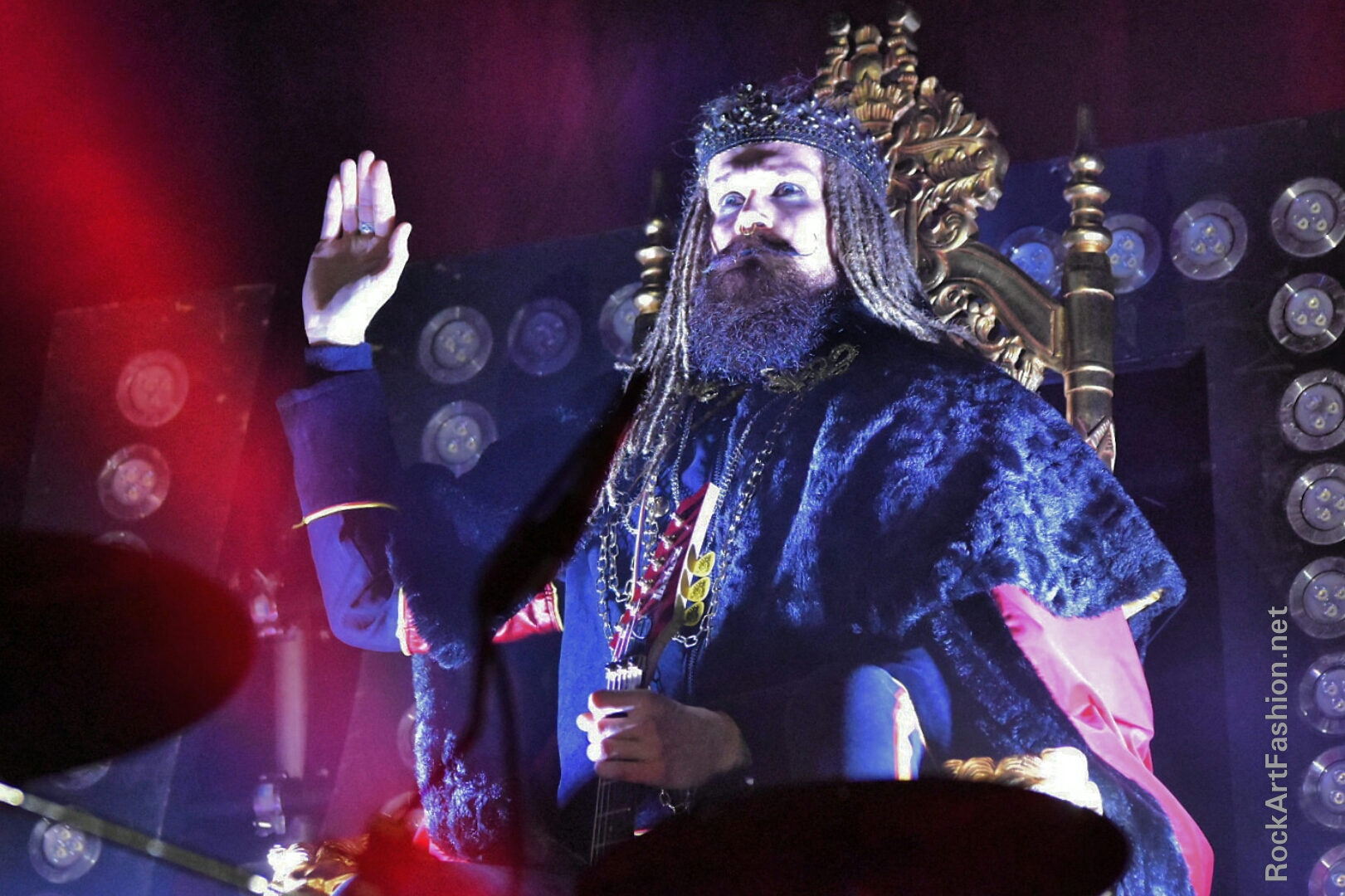 Comme sur l’album, le show débute avec « Glory To Our King » joué dans les haut-parleurs, et « The King » coiffé d’une couronne, une cape sur les épaules et sa guitare en guise de sceptre, fait son apparition sur un trône géant derrière la batterie.