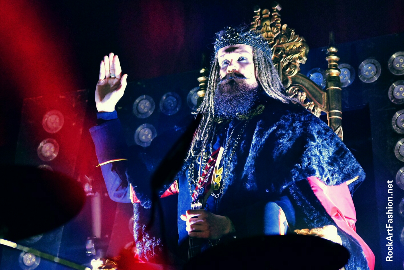 As the album, the show opens with Glory To Our King played over the speakers, the band took to the stage with “The King” wearing cape, crown and guitar as sceptre) appeared on giant throne behind the drumkit and calmly strumming his guitar on Legend Of The King.