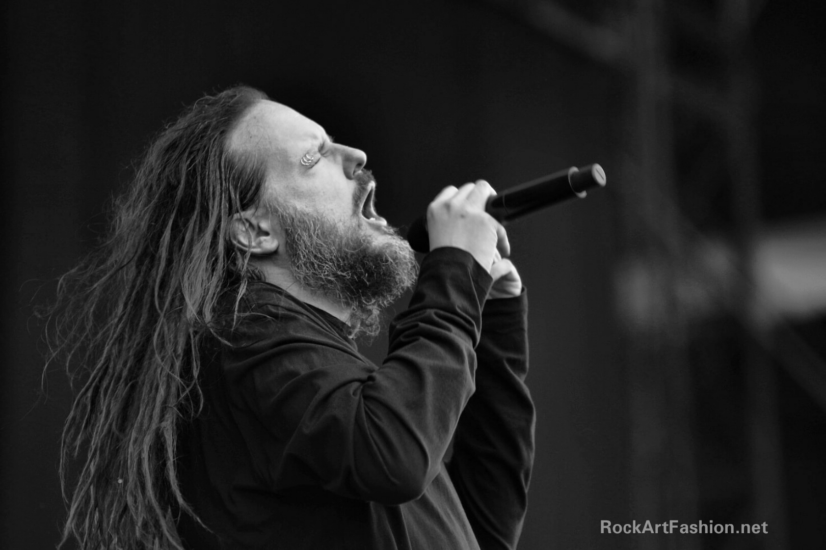 I start the final day with JONATHAN DAVIS, who is here to present his solo project Black Labyrinth. Accompanied by a multitude of musicians – contrabass, violin, keyboard, the charismatic singer of Korn offers a very different sound adventure, with catchy songs as the single What It Is and also some tracks of the film Queen of the Damned soundtrack. A sleek show that plunges us into exciting soundscapes.