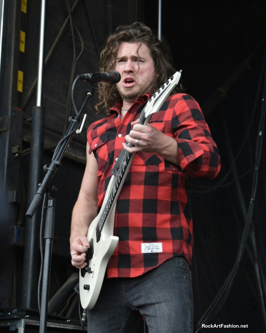 Bandana rouge autour de la tête, lunette de soleil, jeans déchirés et chemise à carreaux attachée autour de la taille, le chanteur changera de vestes en cuir et de chapeaux plusieurs fois dans la soirée.