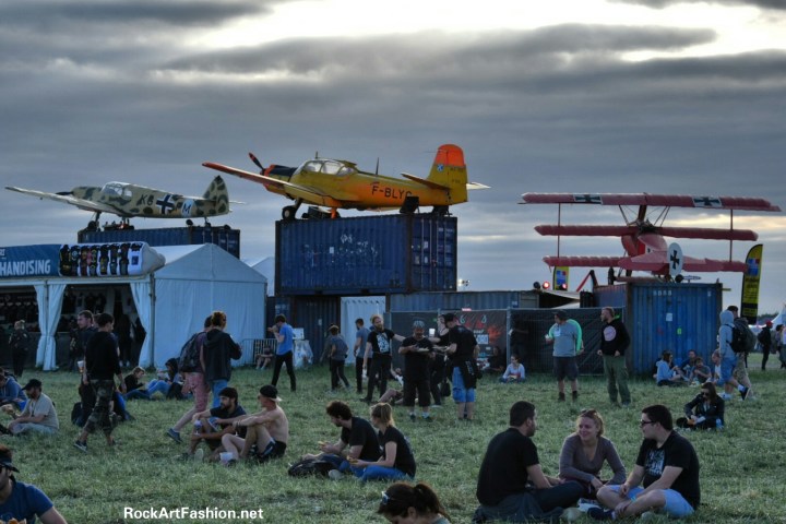 77 great artists, big headliners, bands in full expansion, great discoveries, it was difficult to choose between the 4 stages – two Main stages 1 and 2, a 3rd one under a tent – Warbird, a 4th tiny one – Spitfire – as well as a 5th stage in the campsite. The Sun and the cool mood was there and festivalgoers were able to take full advantage of concerts but also of international cuisine or shops offering a large range of Rock N roll items. We were able to walk between planes decorated containers or to relax on benches crafted of pallets or old tires.