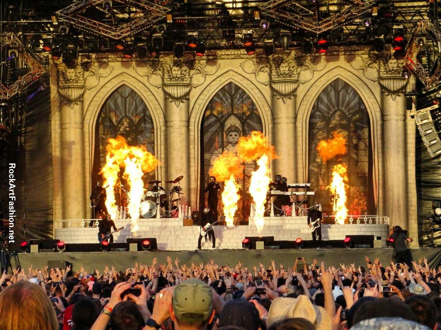 OZZY OSBOURNE, the headliner of the day, arrives on stage. Two giant rectangular screens flank a giant cross-shaped one in the centre of the stage. After Cathedral setting of Ghost’s show, it is definitely special church day atmosphere.