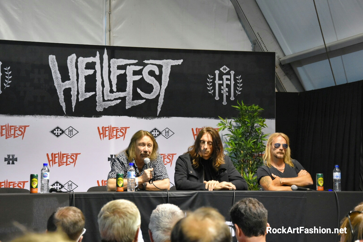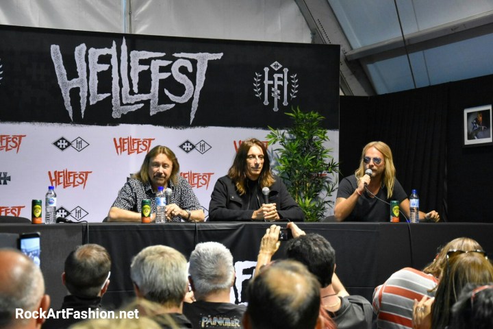 Salle archi pleine pour la conférence de presse Judas Priest. Ian Hill (basse), Les Binks (batterie) et Richie Faulkner (guitare) réponds aux questions concernent le nouvel album, Firepower, fraichement sorti dans les bacs. Ils affirment que l’album n’est pas un retour conscient à leurs racines ni le désir de revisiter leur anicien son mais juste une volonté de faire un vrais album Judas Priest, classique et heavy métal. Et le résultat est là. C’est le 19 -ème album et la suite sera le 20eme si tout va bien, promet Ian Hill. Pour l’instant, ils vont se concentrer sur la tournée car jouer sur scène – ça c’est Rock N’ Roll.