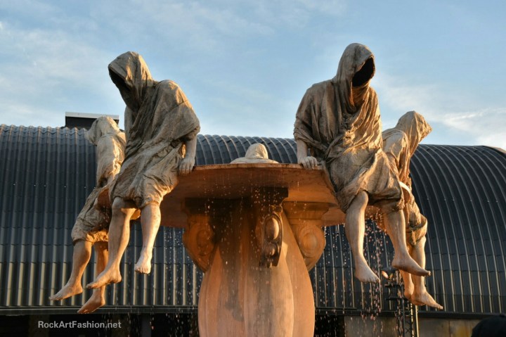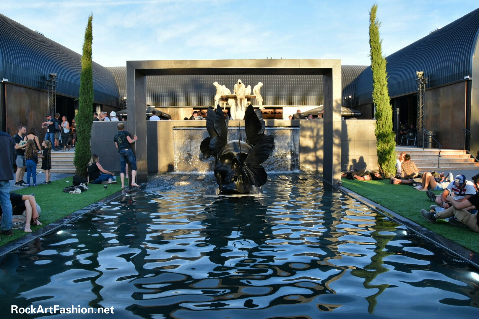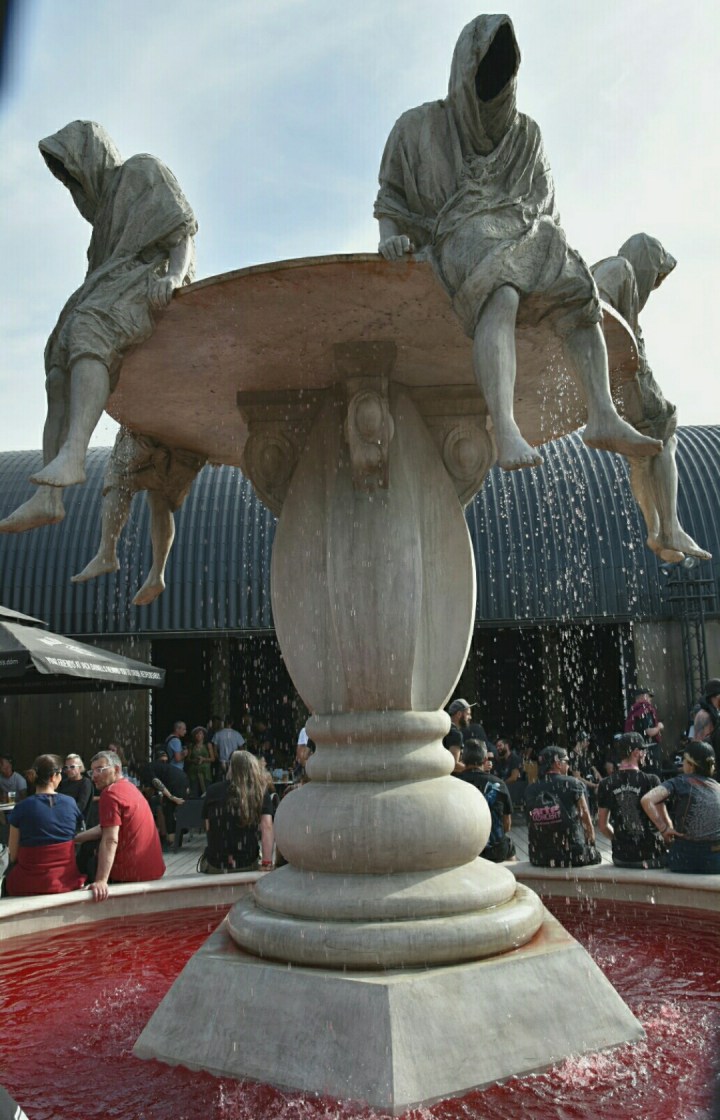 En espace VIP, on a retrouvé l’élégant bar gothique aux allures de cabinet de curiosités où on pouvait suivre aussi les matchs de foot (Coupe du Monde oblige), la jolie fontaine bien surveillée par les 4 gardians du temple du métal, cette fois suspendus au-dessous d’une eau rouge sang, et le bassin qui sert de piscine pour certains courageux.