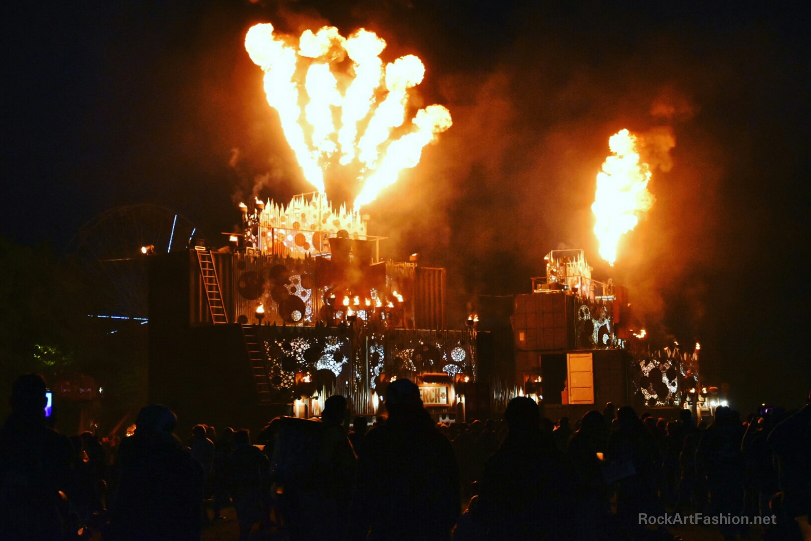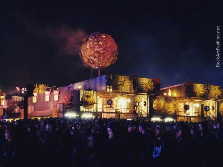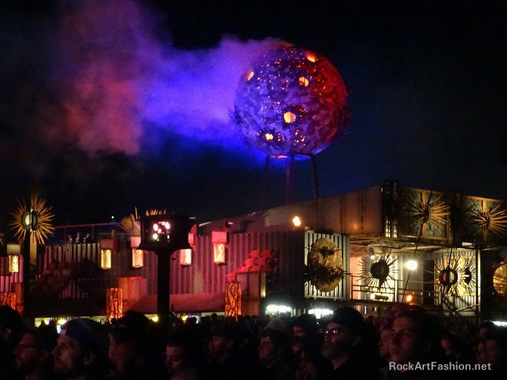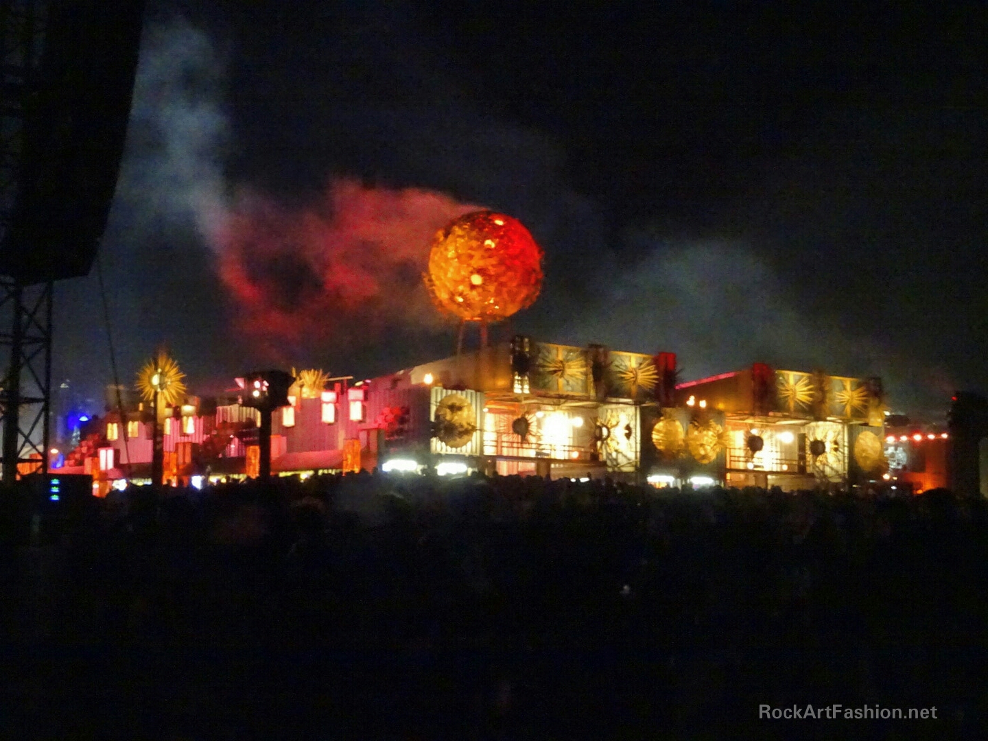 6 scènes. 2 Main Stage flanquées de 3 écrans énormes permettant de suivre les concerts de très loin et 4 autre scènes – Altar, Temple, Valley, War Zone arrangées à peu près en cercle autour de bars, de restos, des fameux containers arty en fer rouillé ou d’autres ouvres artistiques. La grande roue et les boutiques de merchandising avec les files d’attente gigantesque toujours en place.