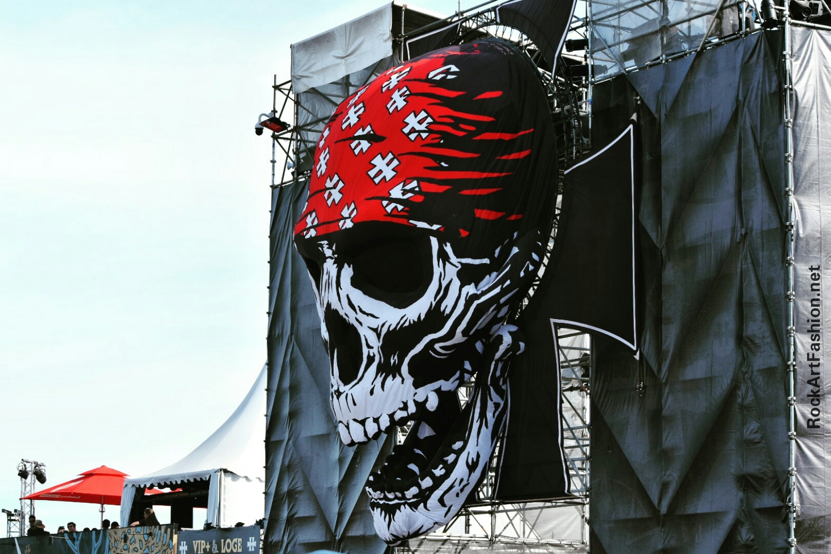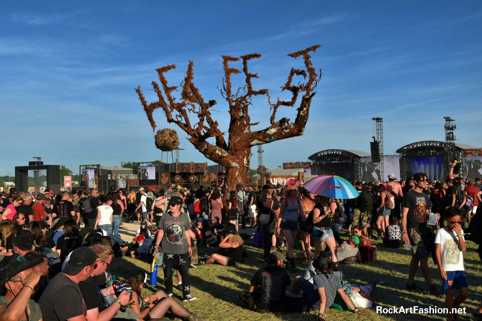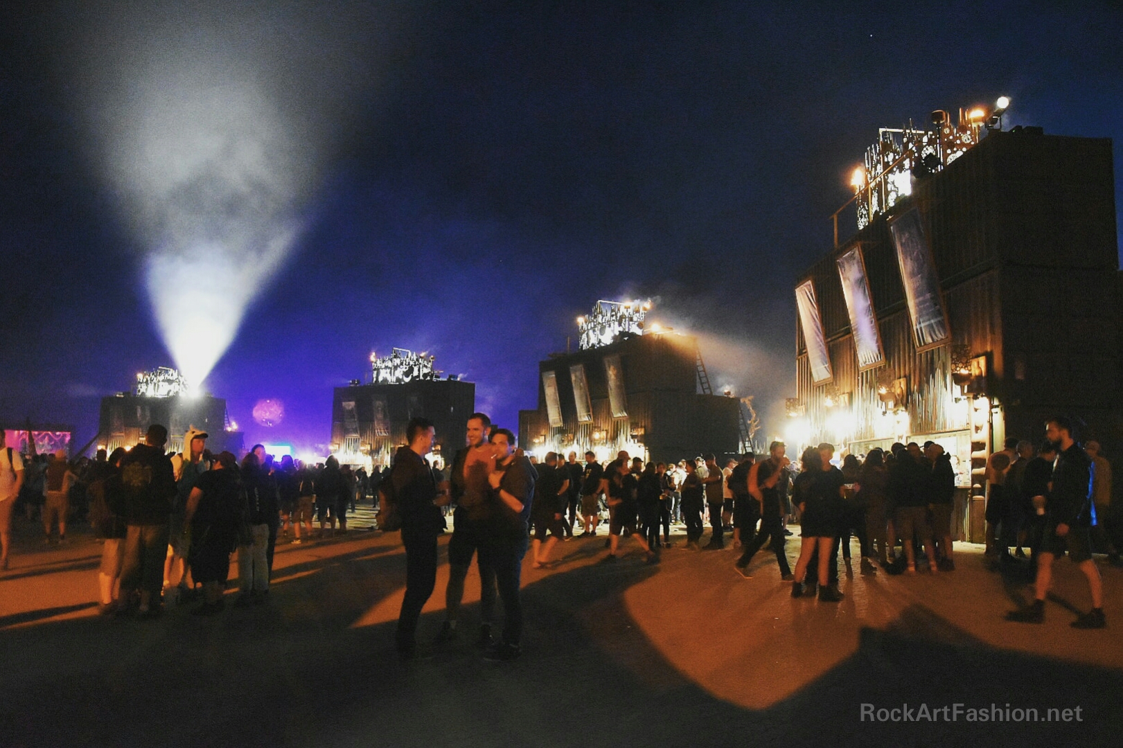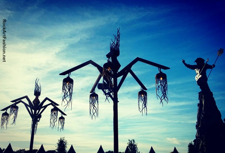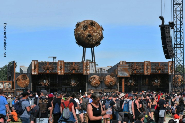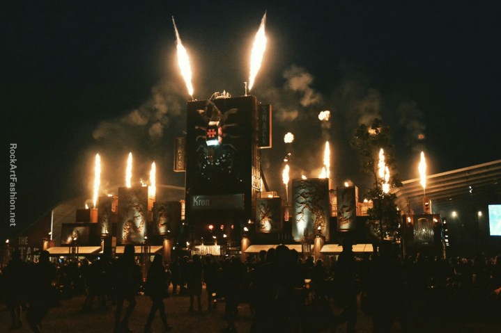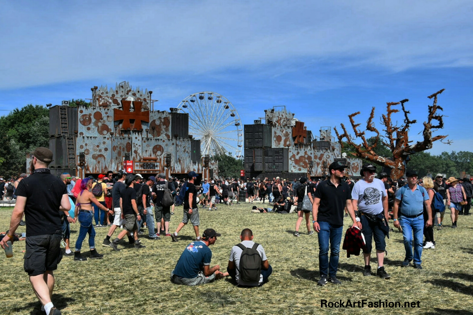 6 stages: 2 Main Stages flanked by 3 huge screens to follow the gigs easily of far and 4 other stages – Altar, Temple, Valley, War Zone arranged roughly in a circle around bars, restaurants, famous arty rusty steel containers or iron sculptures. The Big Wheel and official merchandising shops with huge waiting line still in place.