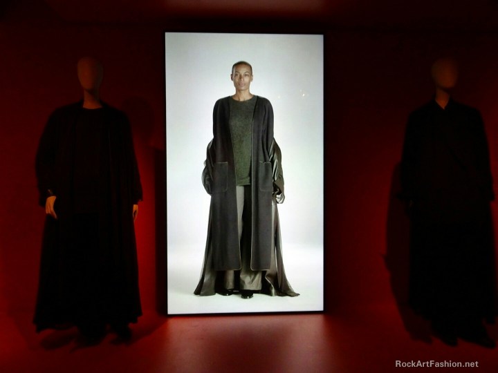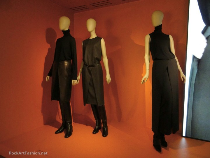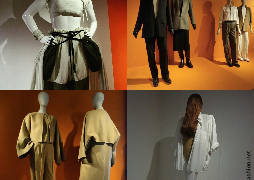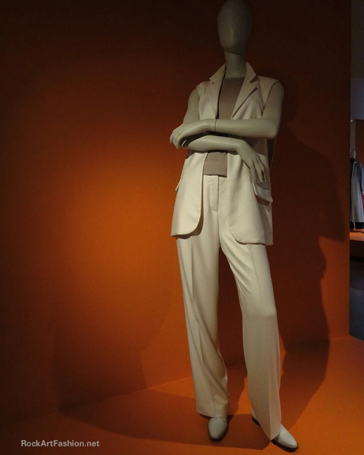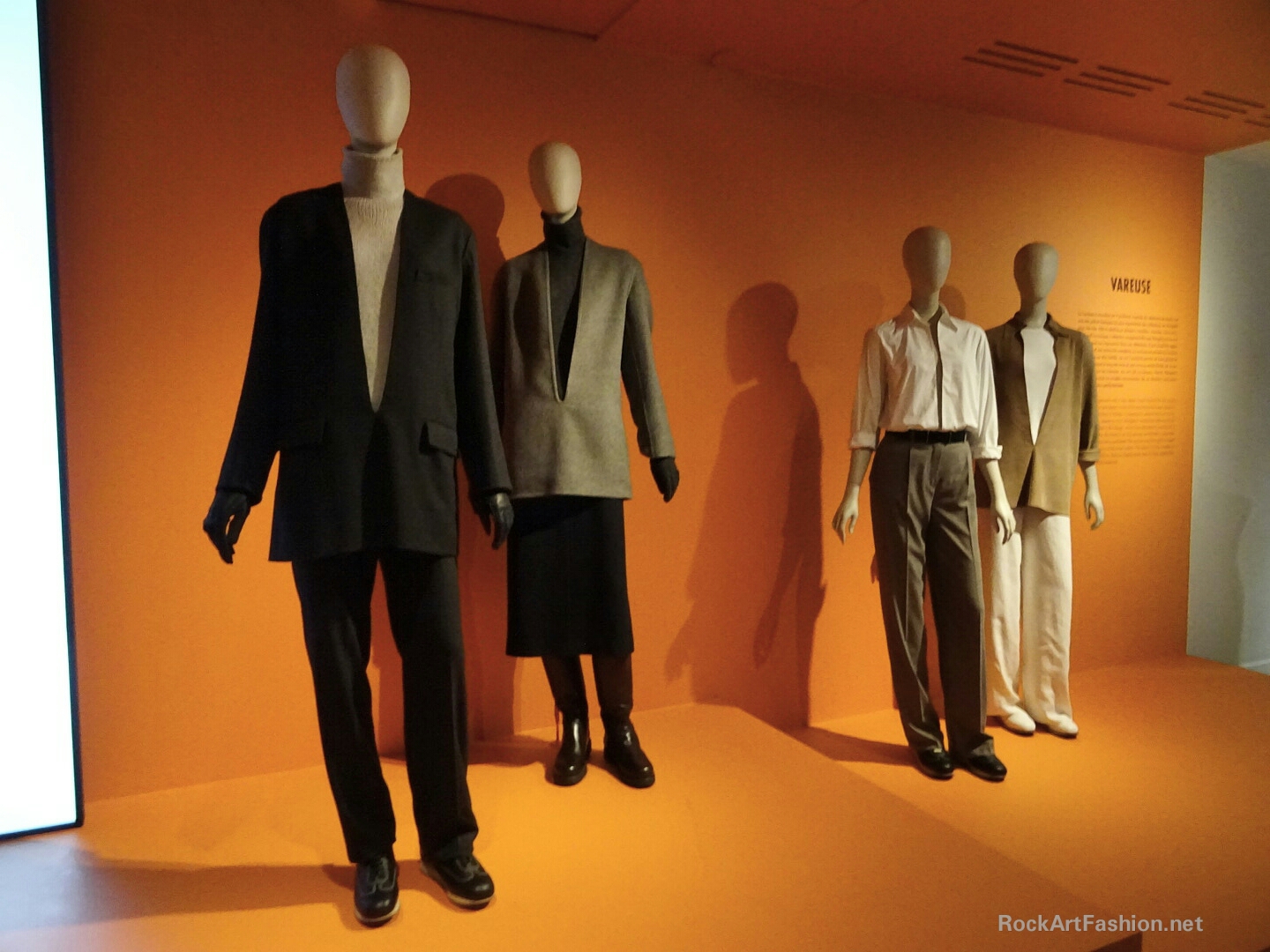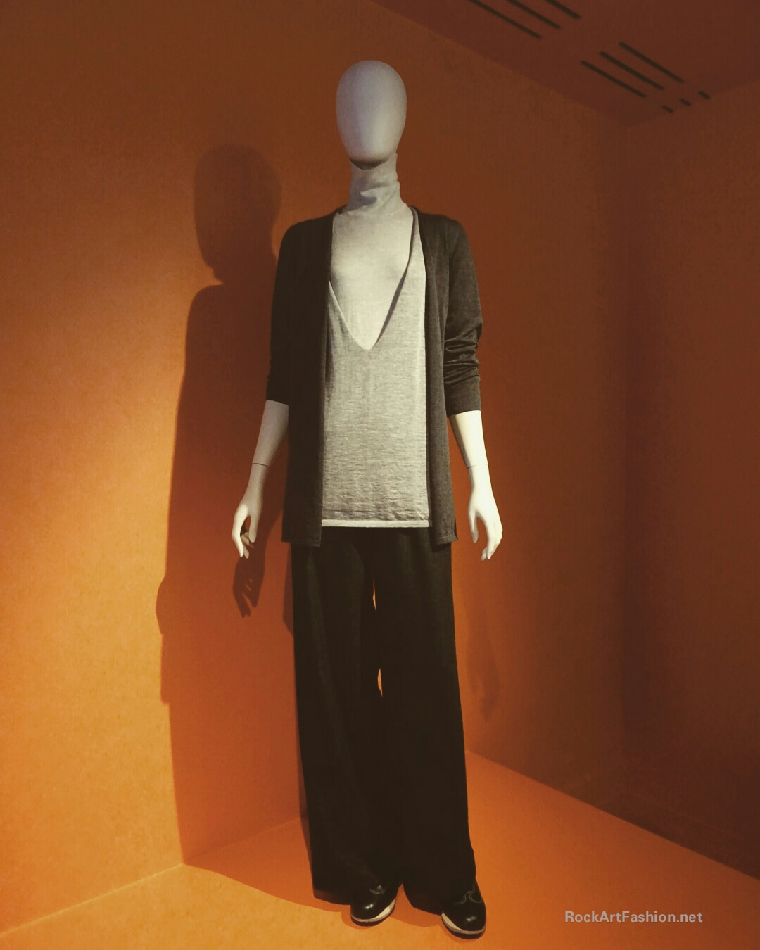 De vêtements représentatifs choisis parmi 12 collections se caractérisent par confort, intemporalité, tonalités neutres, monochromes– gris, noir, ocre, blanc – matières mattes- laine, cachemire, coton et qui se distinguent radicalement de l’image flamboyante qu’on associera à Hermès – les carrés en soie, les couleurs vives et les imprimés.
