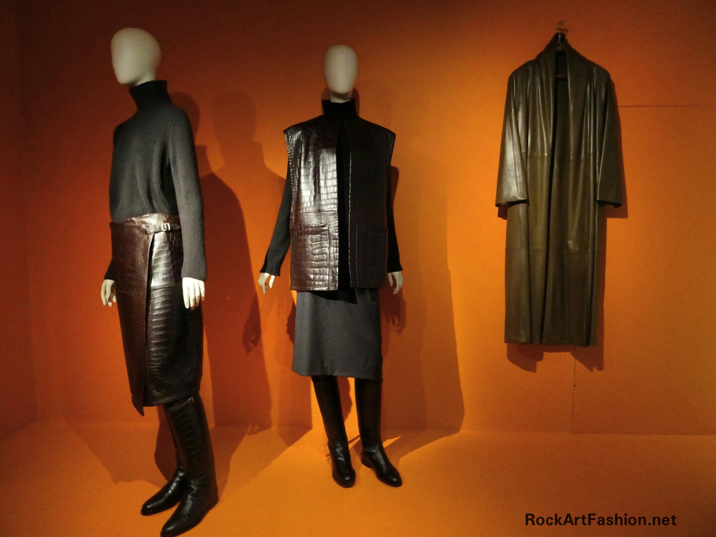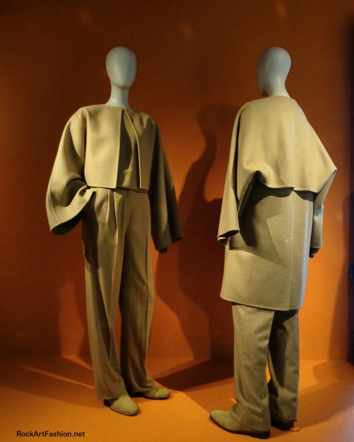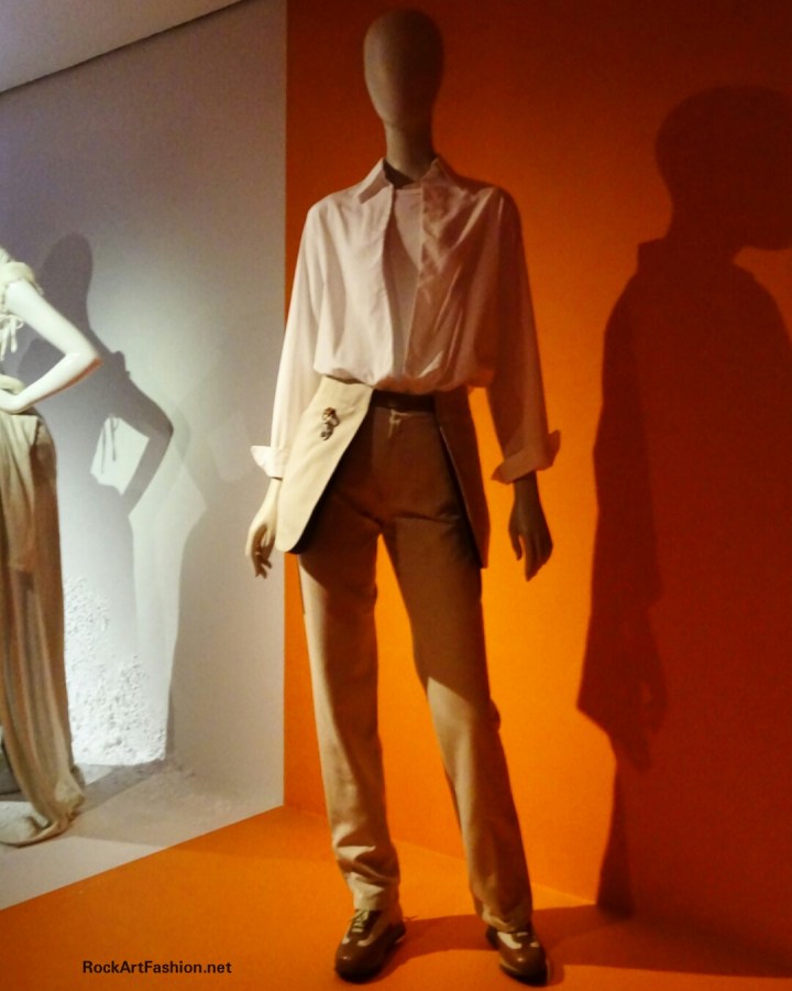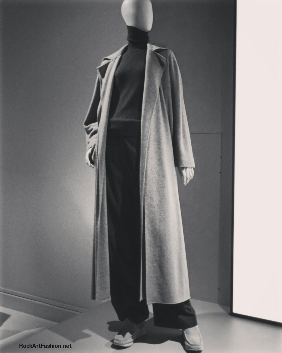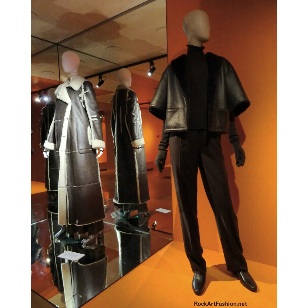 De vêtements représentatifs choisis parmi 12 collections se caractérisent par confort, intemporalité, tonalités neutres, monochromes– gris, noir, ocre, blanc – matières mattes- laine, cachemire, coton et qui se distinguent radicalement de l’image flamboyante qu’on associera à Hermès – les carrés en soie, les couleurs vives et les imprimés.