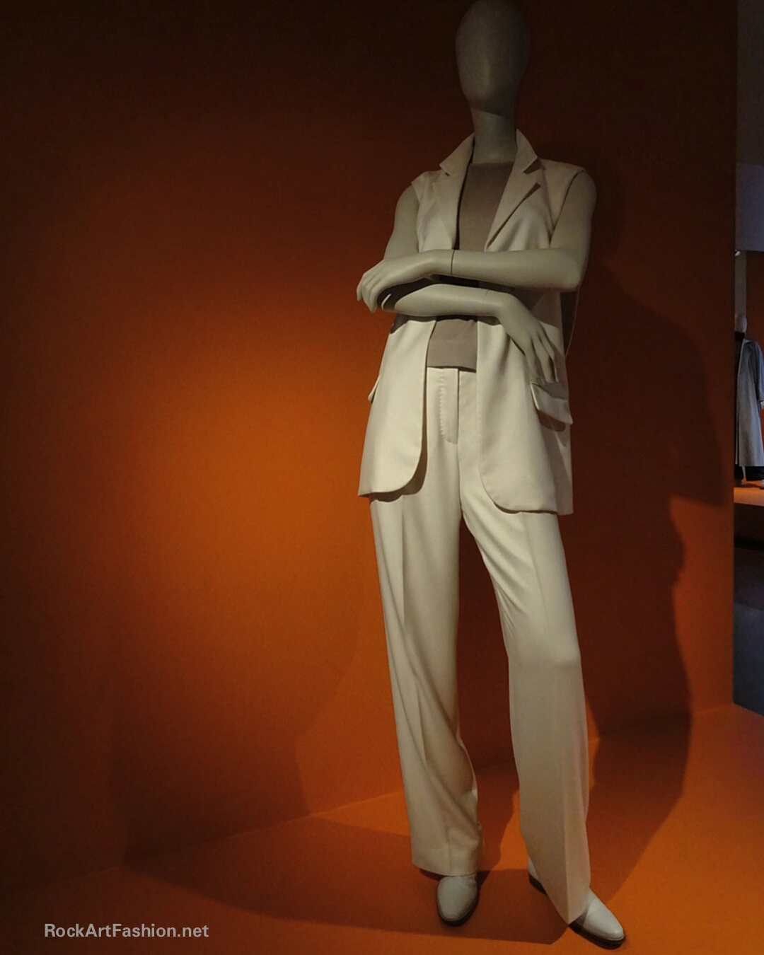 Les displays orange/blanc, respectivement les couleurs d’Hermès et de la Maison Margiela, soulignent le dialogue constructif et opposition radicale et tracent deux voies parallèles entre ses créations pour Hermès et sa marque éponyme.