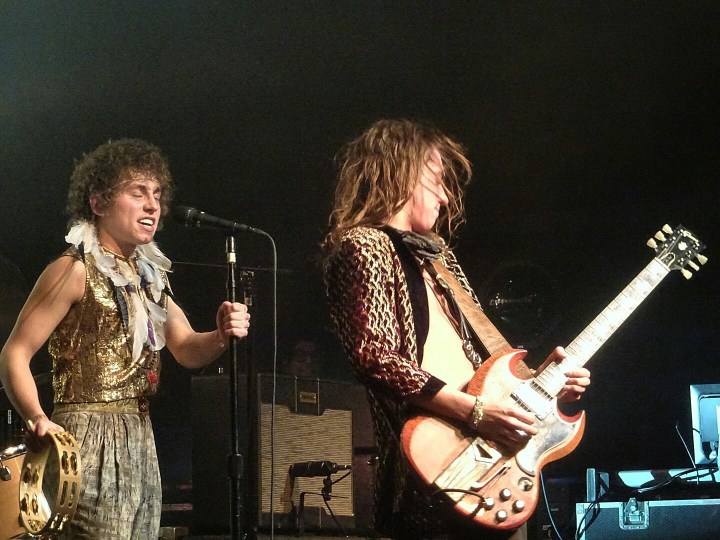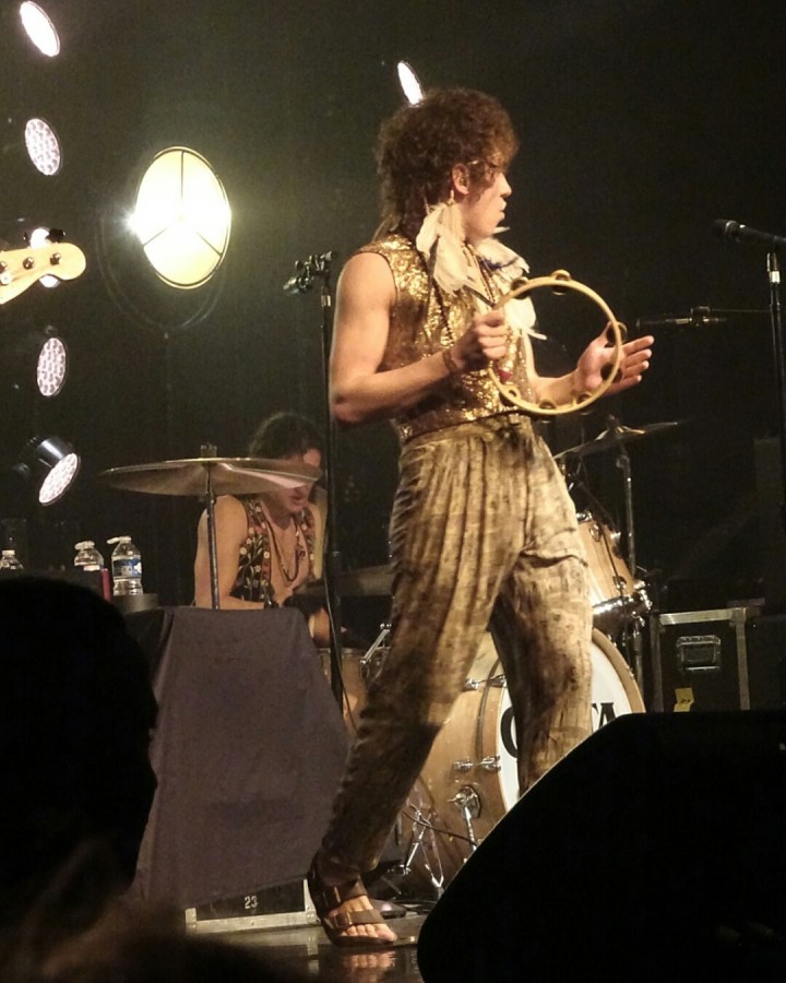 Plumes, headband, haut doré, pantalon fluide et sandales birchen stock pour le chanteur Josh, jolie veste ouverte sur un torse nu couvert de colliers pour Jake, son jumeau, à la guitare, gilet et grand plastron ethnique, pieds nus pour Sam à la basse et gilet coloré pour Danny à la batterie, les jeunes américains restent fidèles à leur look flamboyant hippy seventies.