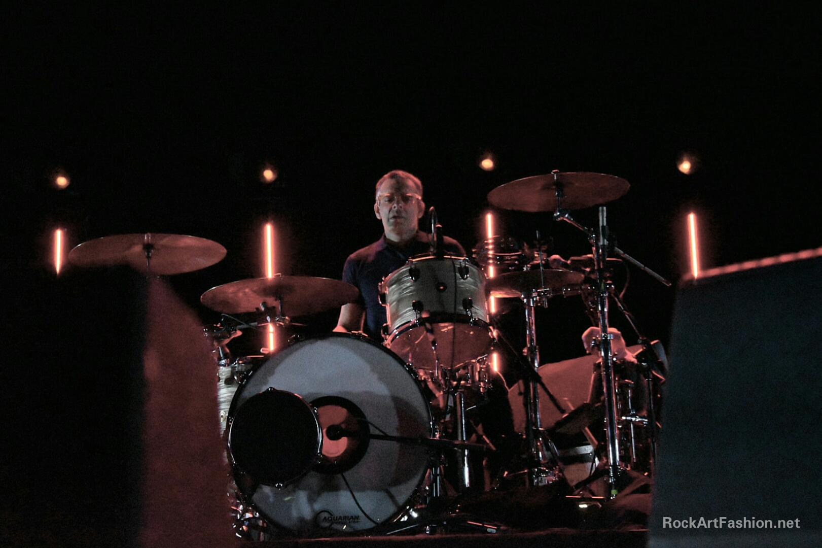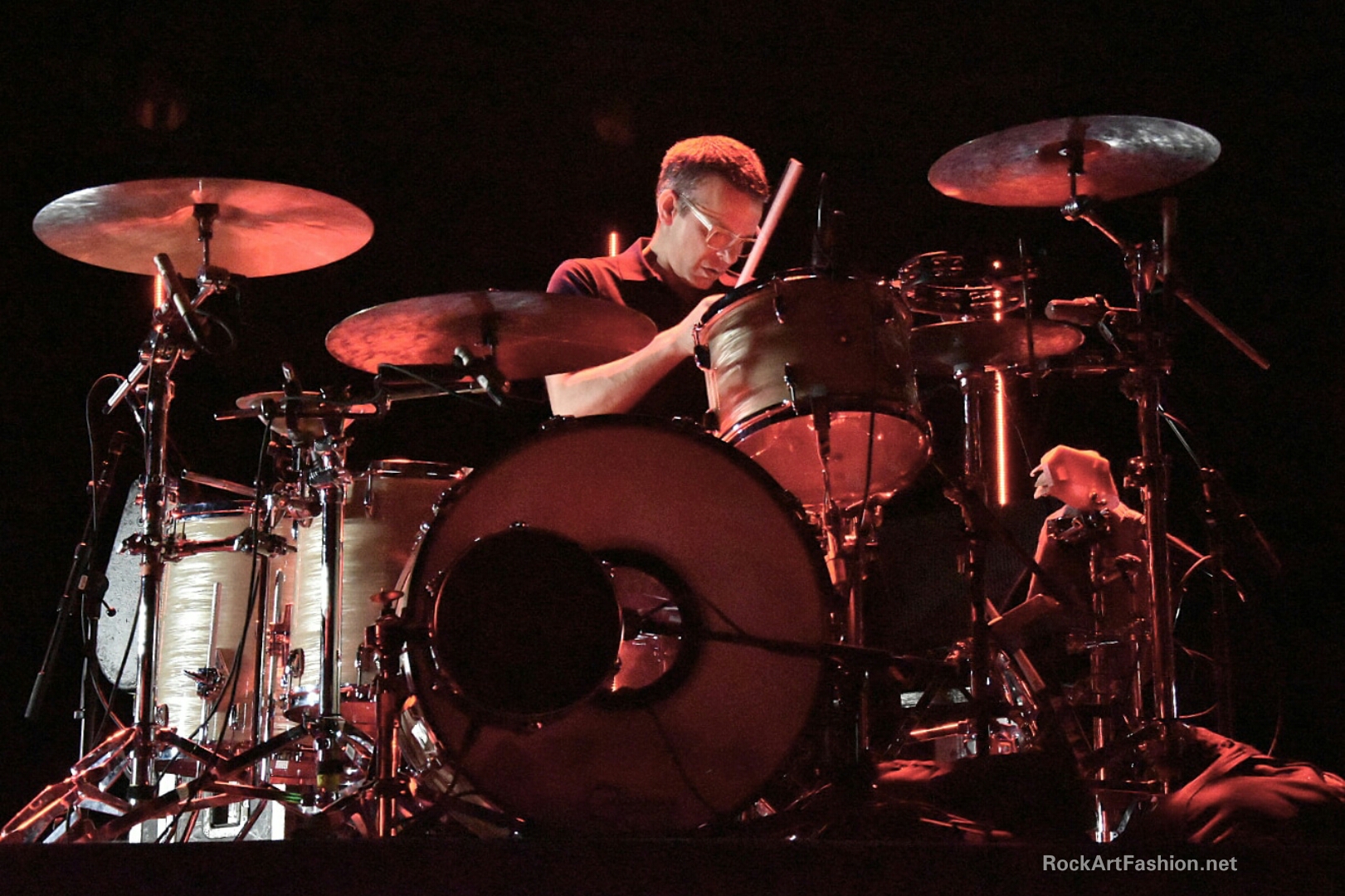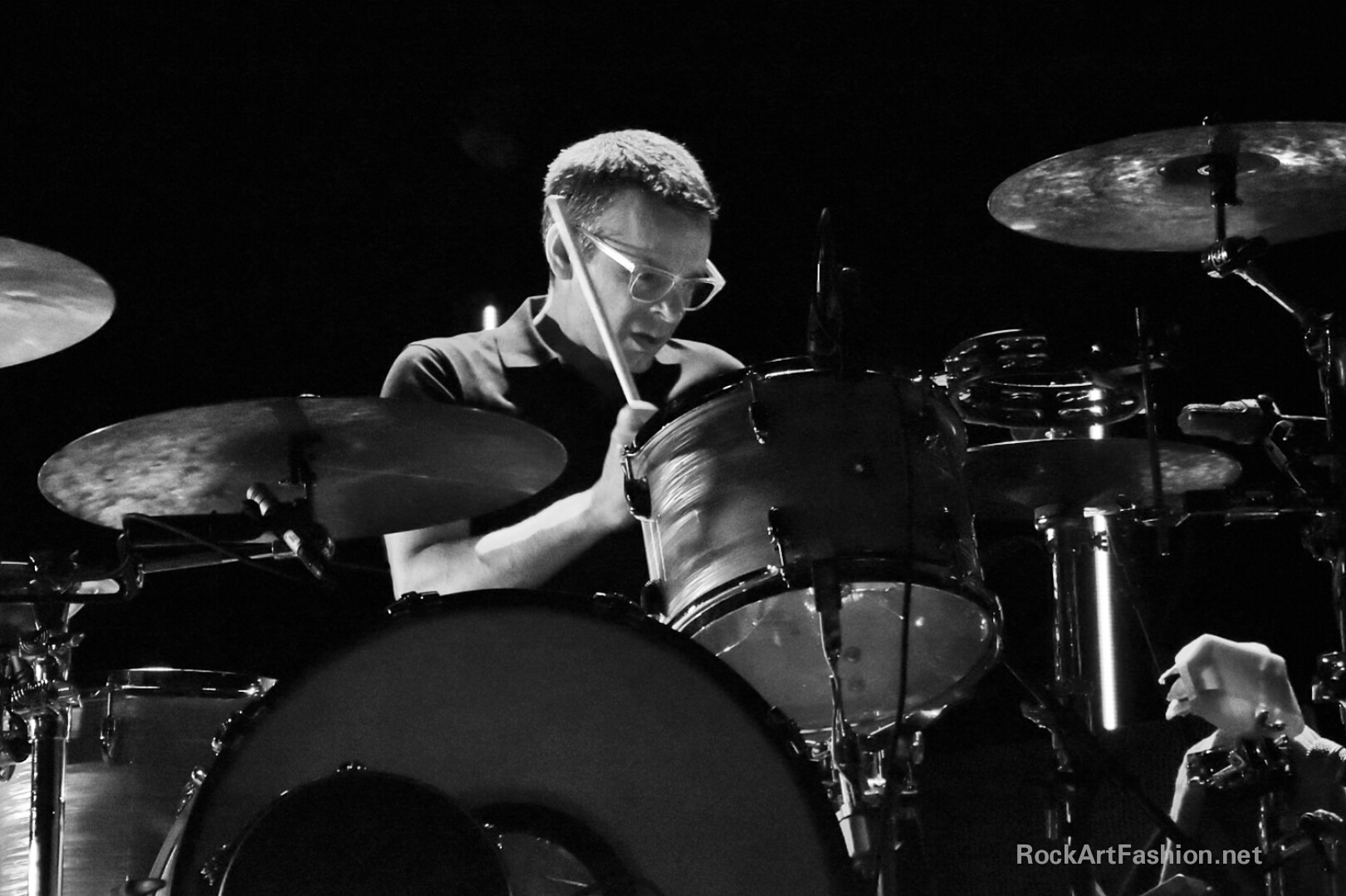 Sam Fogarino est concentré et sérieux derrière son kit, on a l’impression que le lead est entre ses mains.