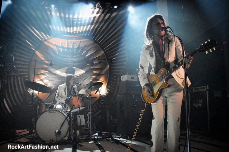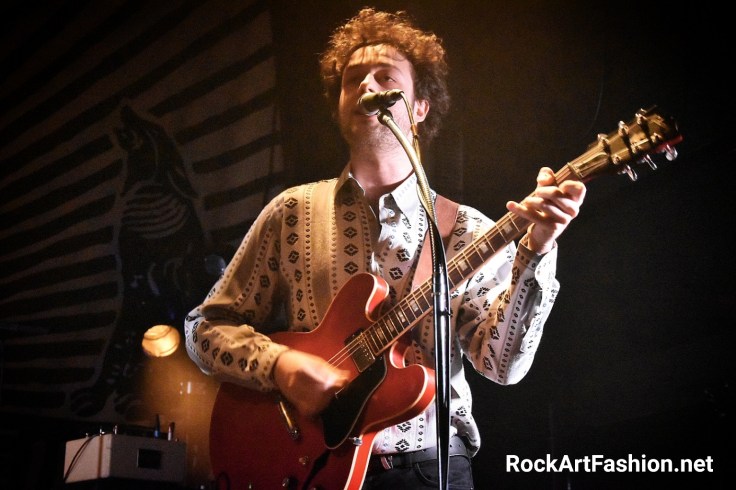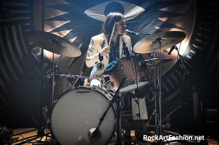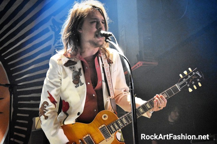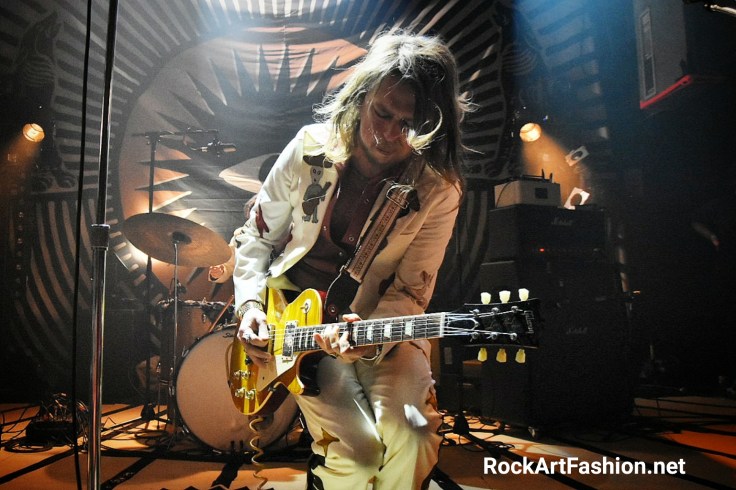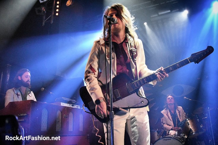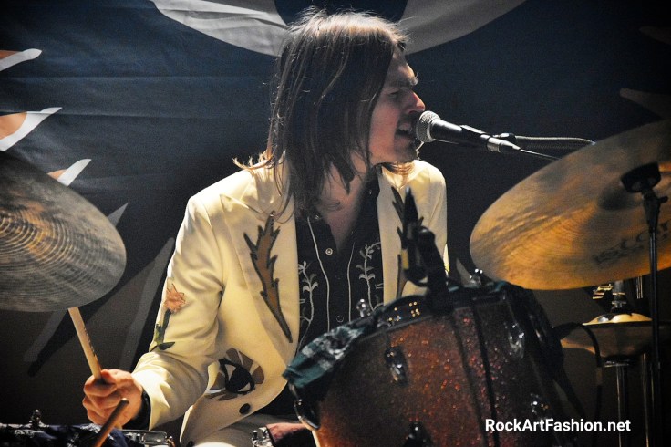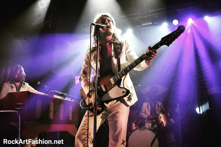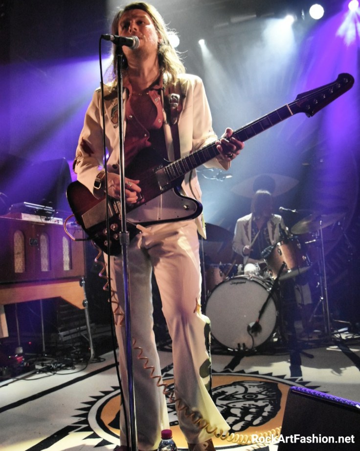 C’est le tour de DEWOLFF de faire leur apparition. Habillés dans leur costumes nudie (ils nous avaient parlé dans l’interview de la difficulté de les trouver) blancs, avec de broderies – des fleurs, un mariachi sur le revers de la veste ou le mot « El Papi » écrit sur le dos du chanteur, pantalons patte d’éph, bottes en croco et cheveux longs. L’effet vintage n’est pas mal du tout.
