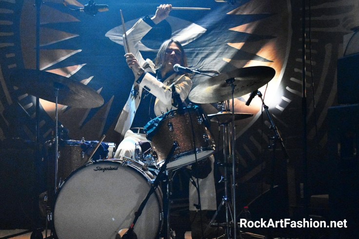 It’s DEWOLFF‘s turn to make their entrance. Wearing their nudie costumes (they had told us in the interview about the difficulty of having them) white, with embroideries, big flowers, “El Papi” written on Pablo’s back, flare pants, croc boots and long hair. The retro effect is not bad at all.