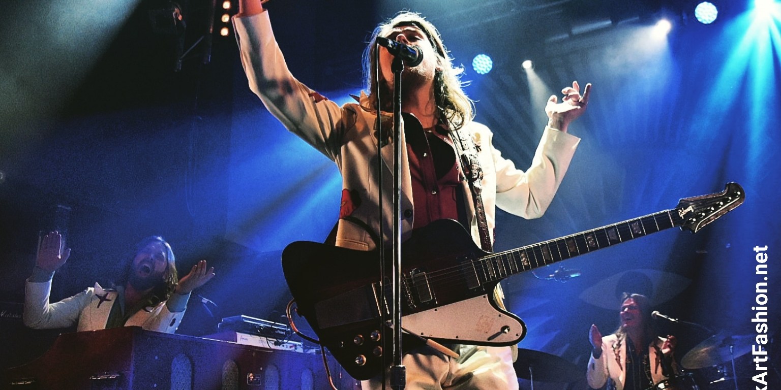 C’est le tour de DEWOLFF de faire leur apparition. Habillés dans leur costumes nudie (ils nous avaient parlé dans l’interview de la difficulté de les trouver) blancs, avec de broderies – des fleurs, un mariachi sur le revers de la veste ou le mot « El Papi » écrit sur le dos du chanteur, pantalons patte d’éph, bottes en croco et cheveux longs. L’effet vintage n’est pas mal du tout.