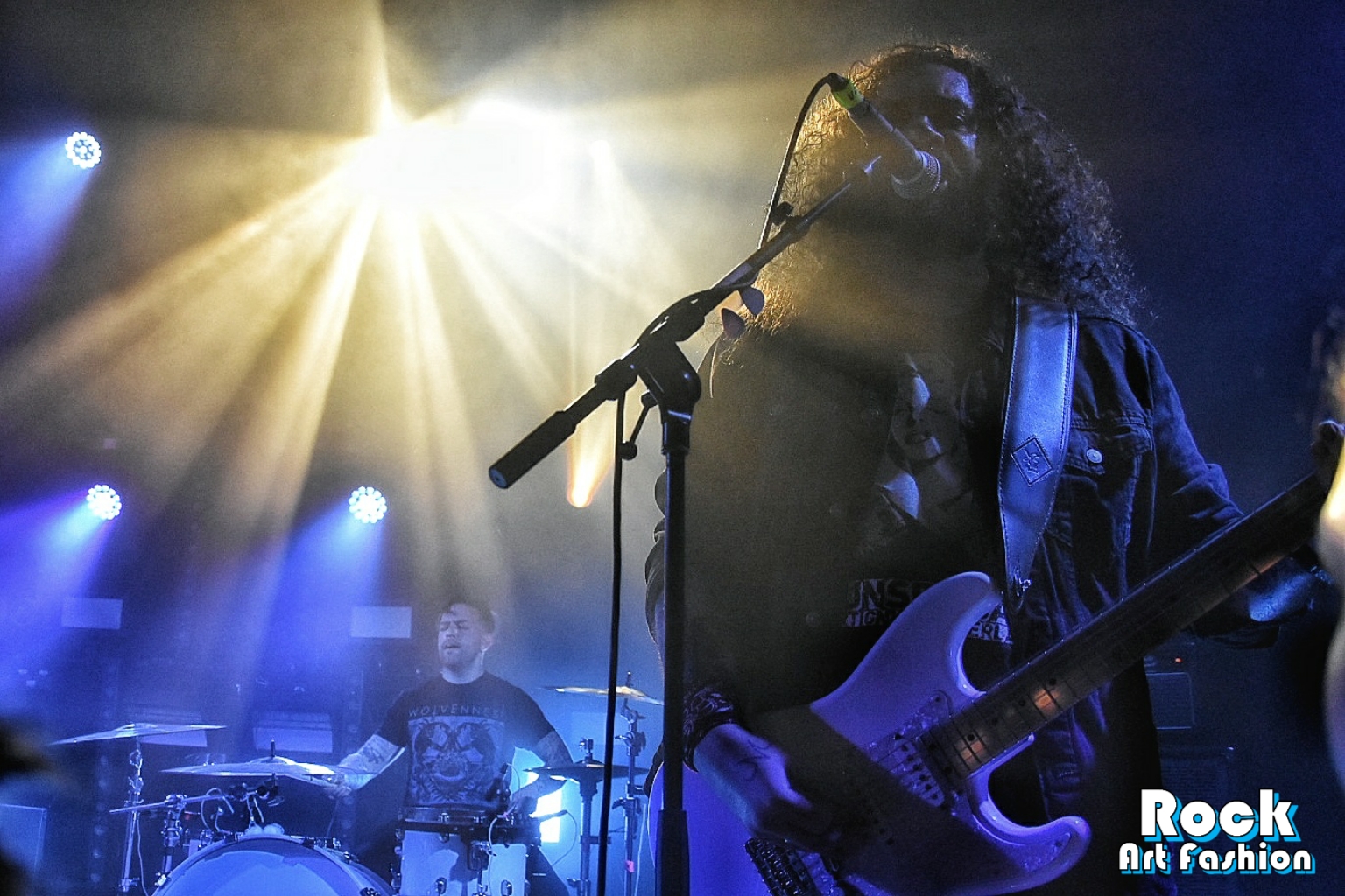 Short break and HANGMAN’S CHAIR arrive on stage. Cédric Toufouti (vocals and guitar), Clément Hanvic (bass), Julien Chanut (guitar), Mehdi Thépegnier (drums) start the instrumental intro of An Ode to Breakdown, the opening track of A Loner. The atmosphere is dark and heavy. The lighting provided by the rear spotlights creates a nice against-the-light silhouette effect.