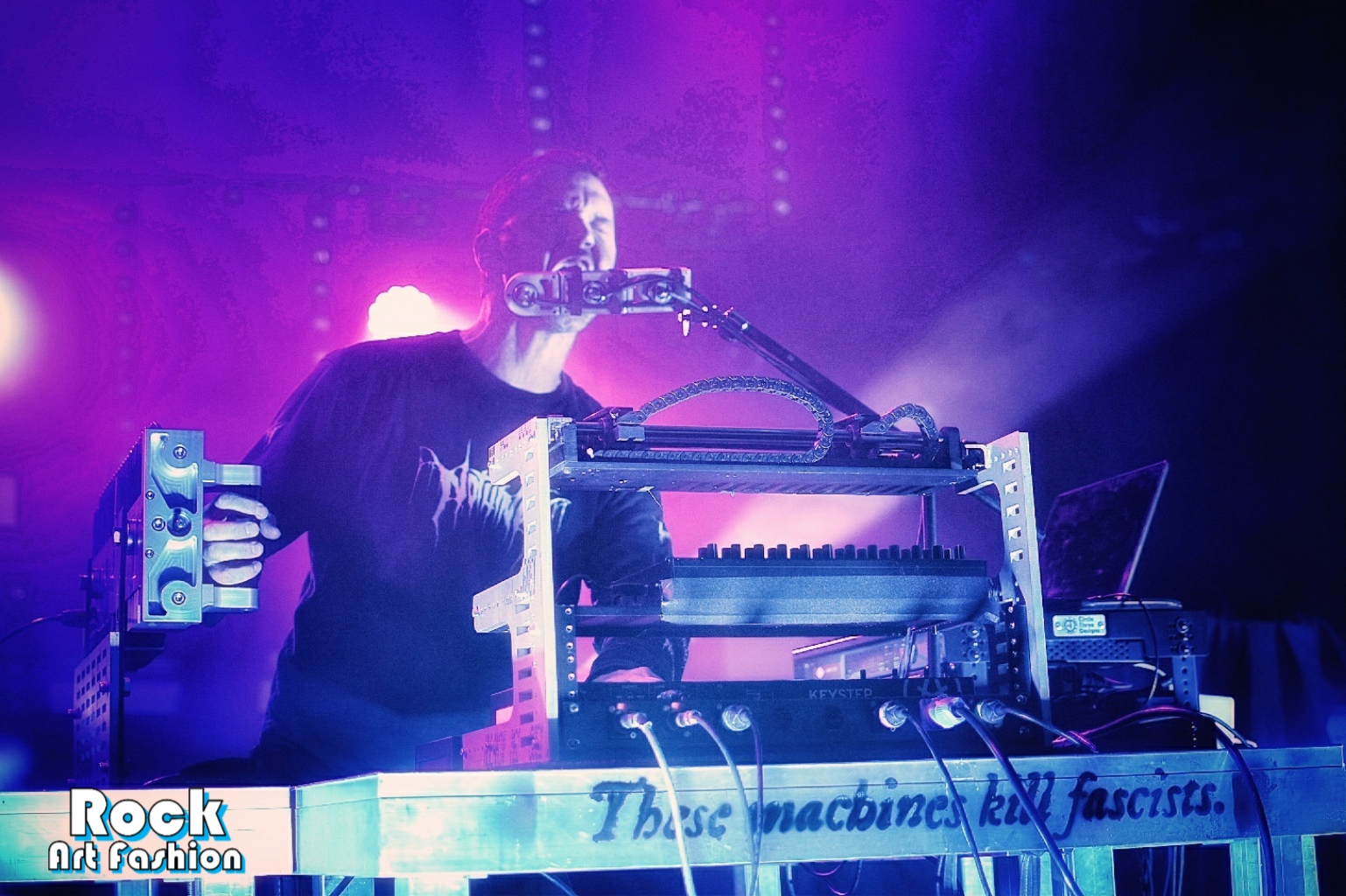 On le retrouve donc derrière une curieuse machine métallique – une sorte de mix entre des platines, une imprimante, un synthé – dotée des nombreuses manettes, boutons et câbles. C’est marqué dessus, « These machines kill fascists ». Il est accompagné par un guitariste.