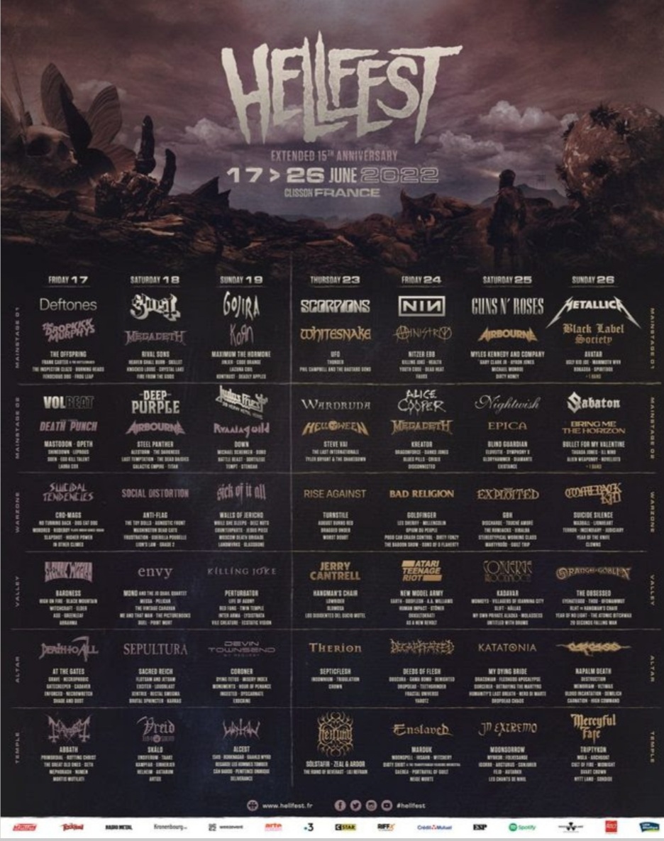 Après deux éditions consécutives reportées à cause de la pandémie de Covid-19, on va essayer de profiter au maximum : voir les plus grands groupes du mondes : Ghost, Judas Priest, Gojira (unique date en festival européen, Airbourne, Megadeth, Scorpions, Wardruna (avec un show spécialement monté pour l’occasion), Helloween (au grand complet), Rise Against, Nine Inch Nails (pour une prestation unique en Europe), Ministry, Alice Cooper, Guns N’Roses (pour la 1ère fois à Clisson avec Axl, Slash et Duff), Nightwish, Black Label Society, Avatar, Sabaton, Bring Me The Horizon, Mercyful Fate, et bien sûr Metallica qui clôturera en beauté ces 7 jours de folie…et aussi découvrir des nouveaux artistes.