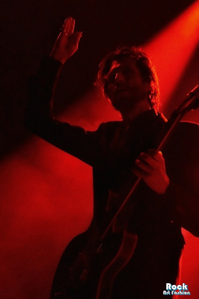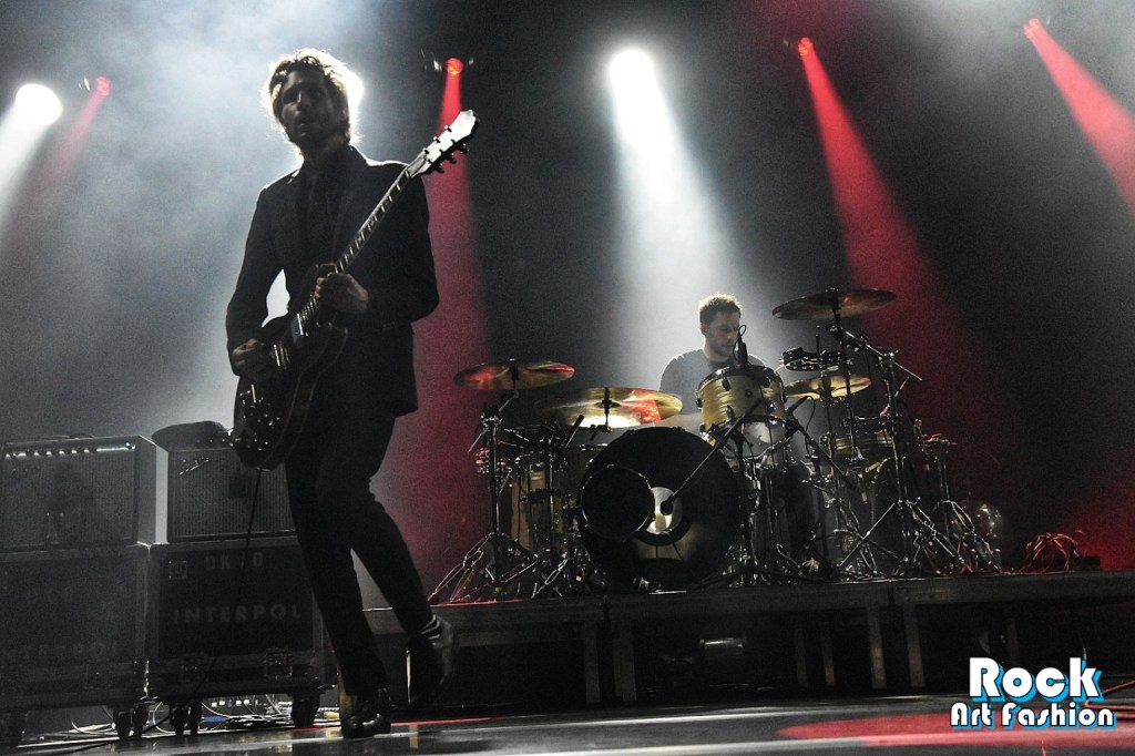 Enfin à 21h10, INTERPOL arrive sur scène. Un par un, des silhouettes habillées en costumes noirs émergent du brouillard baigné par la lumière rouge, couleur si emblématique du groupe. Sous les ovations chaleureuses du public : Paul Banks (guitare-chant) lance un Bonjour et des grands sourires, Daniel Kessler (guitare) lève son verre vers l’audience en guise de « Cheers ».