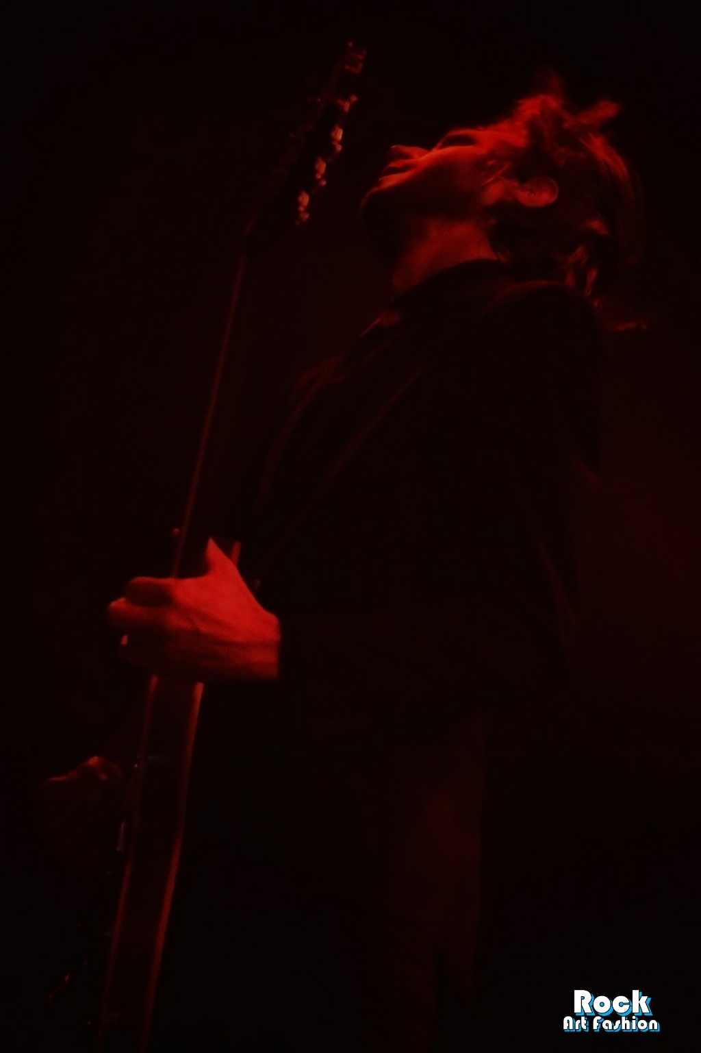 Enfin à 21h10, INTERPOL arrive sur scène. Un par un, des silhouettes habillées en costumes noirs émergent du brouillard baigné par la lumière rouge, couleur si emblématique du groupe. Sous les ovations chaleureuses du public : Paul Banks (guitare-chant) lance un Bonjour et des grands sourires, Daniel Kessler (guitare) lève son verre vers l’audience en guise de « Cheers ».
