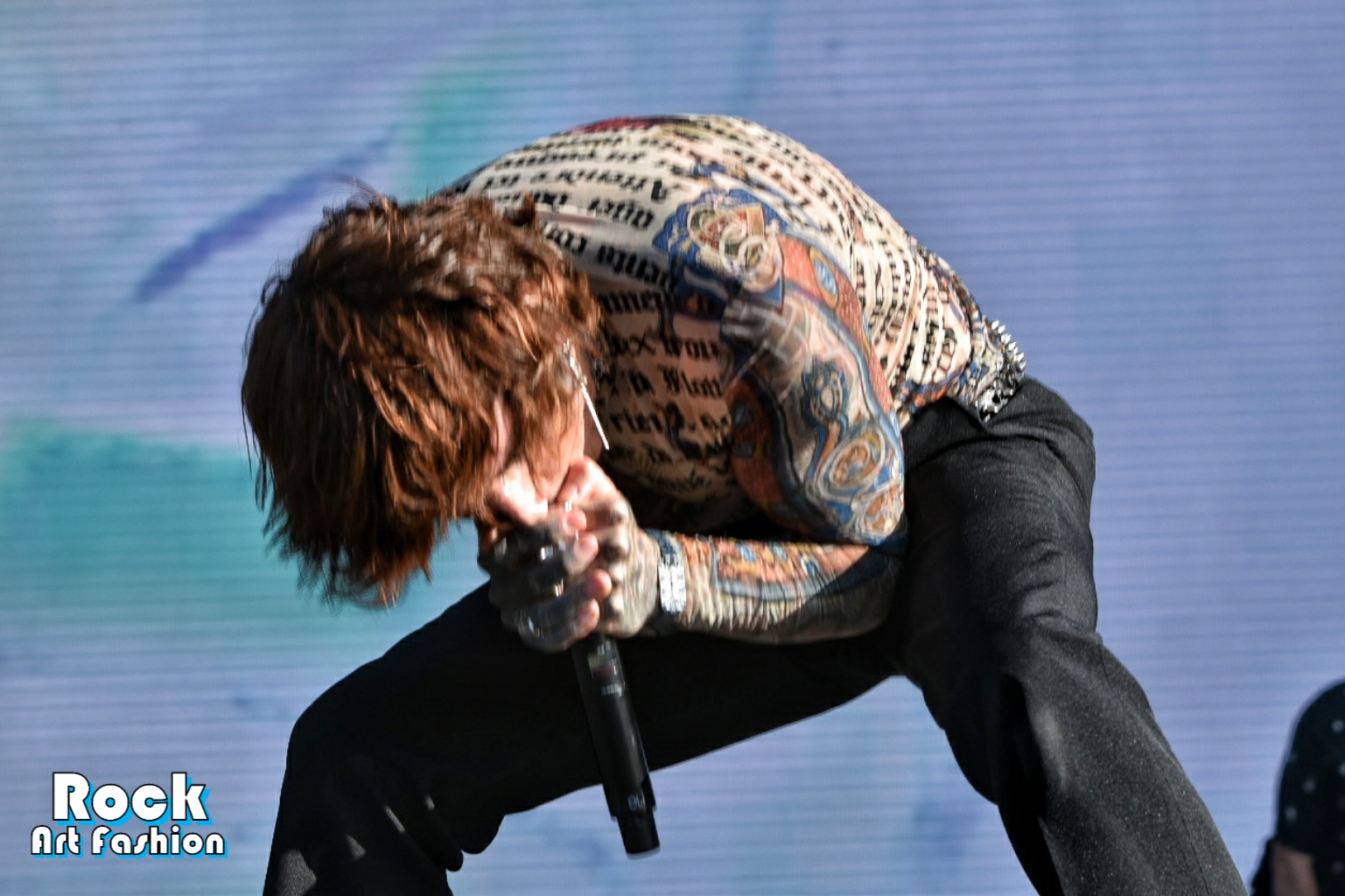 Everyone with their eyes and photo lenses focused on the charismatic leader Oliver Sykes. The ultra-tattooed singer wears a high flesh color imitating fake tattoos that covers his own tattoos.