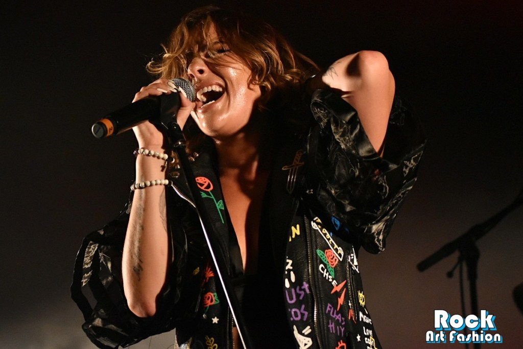 Her vibrant and raspy voice is breath-taking. Despite the heat in the room, no drop in energy, no respite. JJ is 100% speed and motivation. In the middle of the set, she will drop her beautiful jacket, so we can discover a pretty black top that reveals her tattooed back. The temperature is higher and the audience is absolutely conquered. In the front of the stage, the mobile phones film continuously.