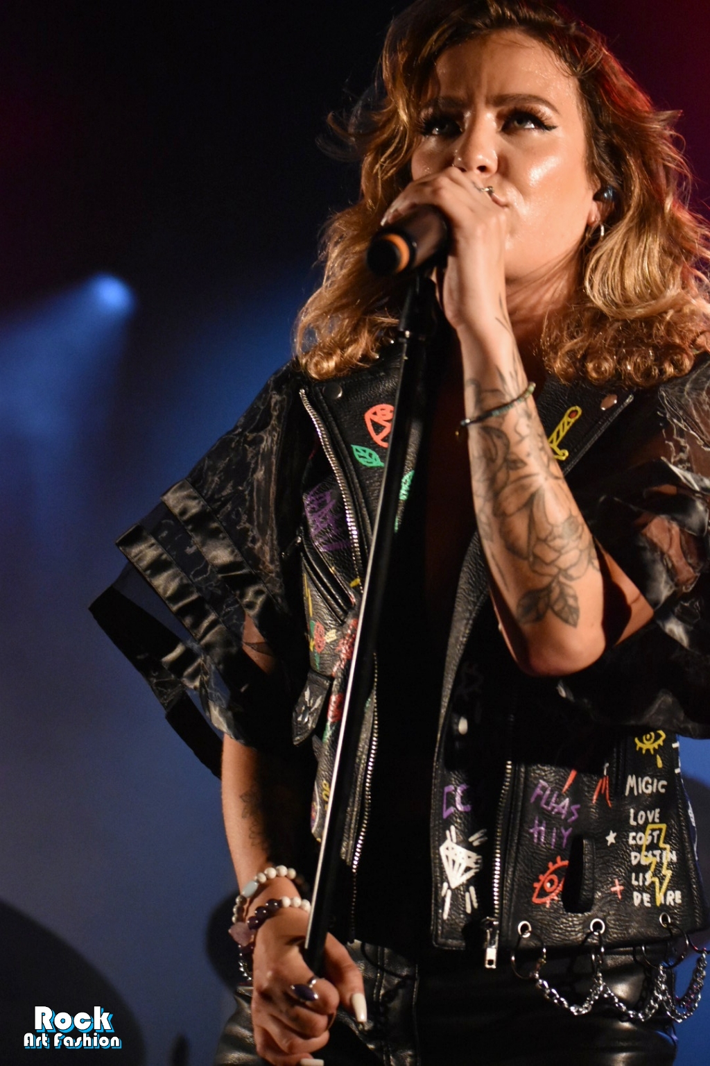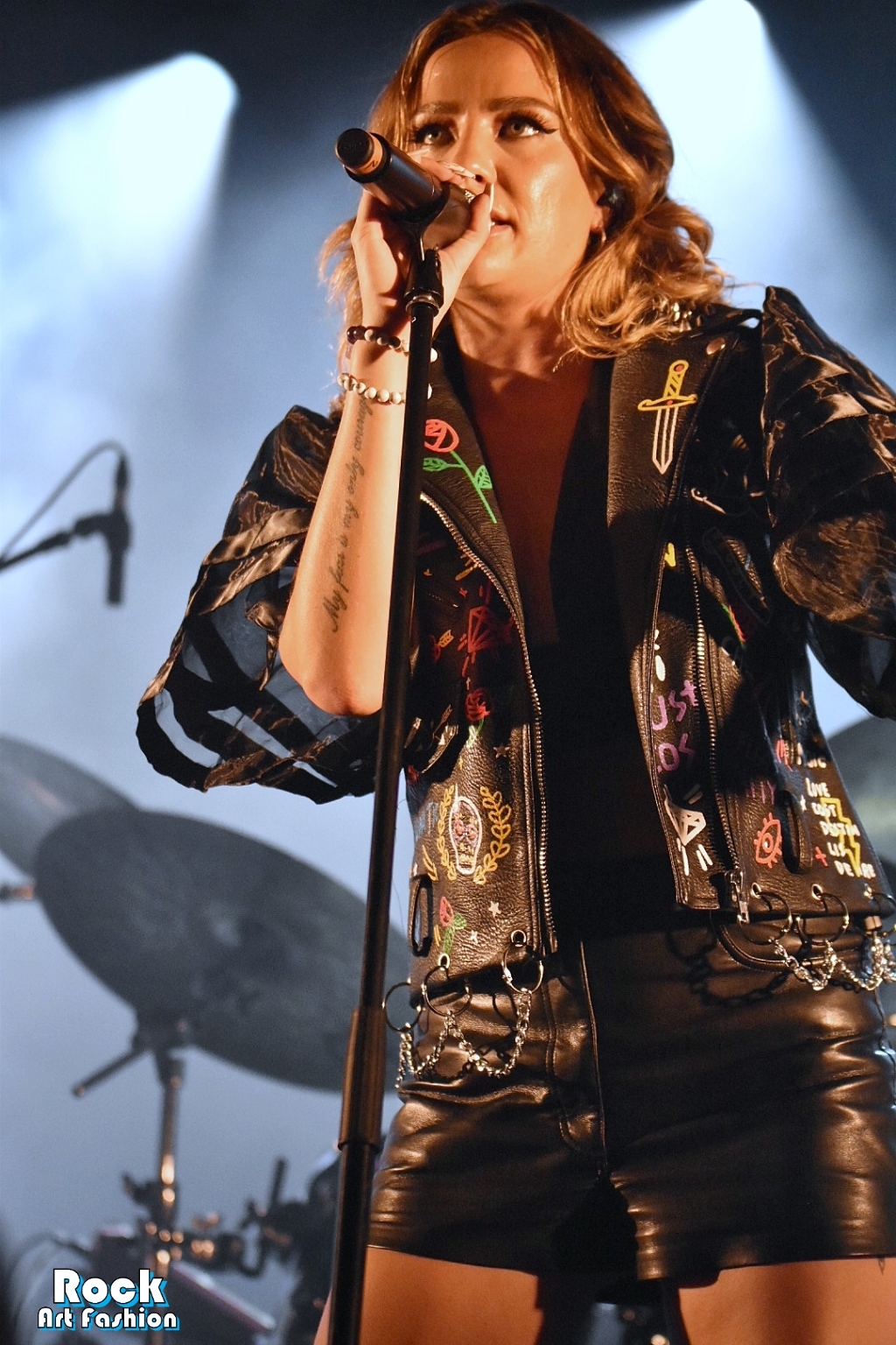 Her vibrant and raspy voice is breath-taking. Despite the heat in the room, no drop in energy, no respite. JJ is 100% speed and motivation. In the middle of the set, she will drop her beautiful jacket, so we can discover a pretty black top that reveals her tattooed back. The temperature is higher and the audience is absolutely conquered. In the front of the stage, the mobile phones film continuously.