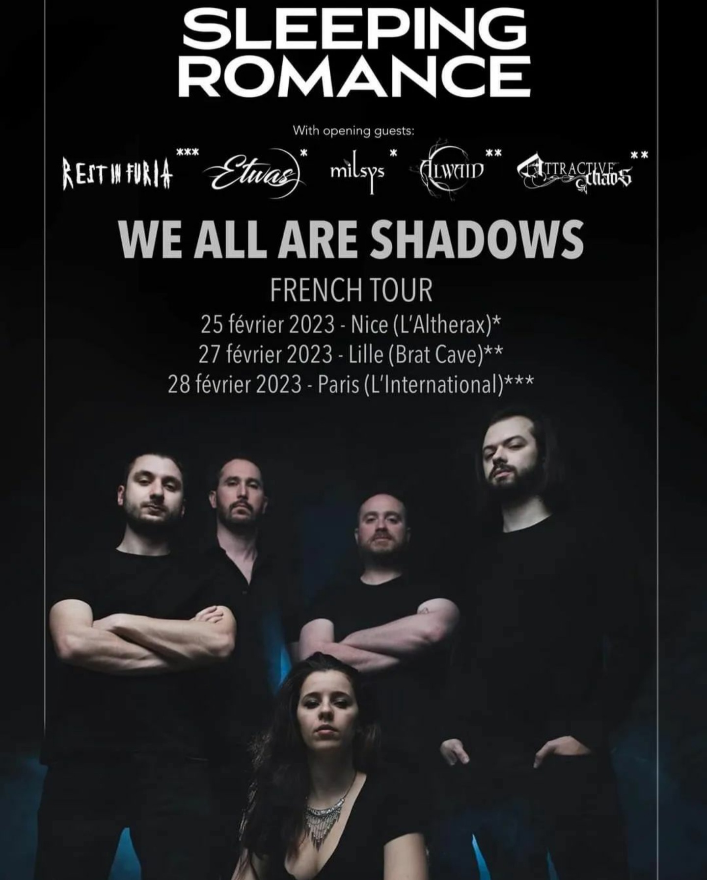 Sleeping Romance is a metal band founded in 2013 by Federico Truzzi (Guitar, Synth, Piano and Production). After two albums in 2013 (Alba) and 2017 (Enligteen), it is with a new singer, Lina Victoria, that the Mediterranean quintet released a third album entitled We All Are Shadows, in October 2022.