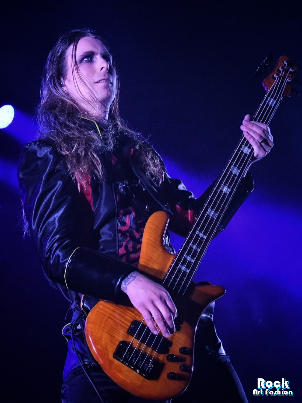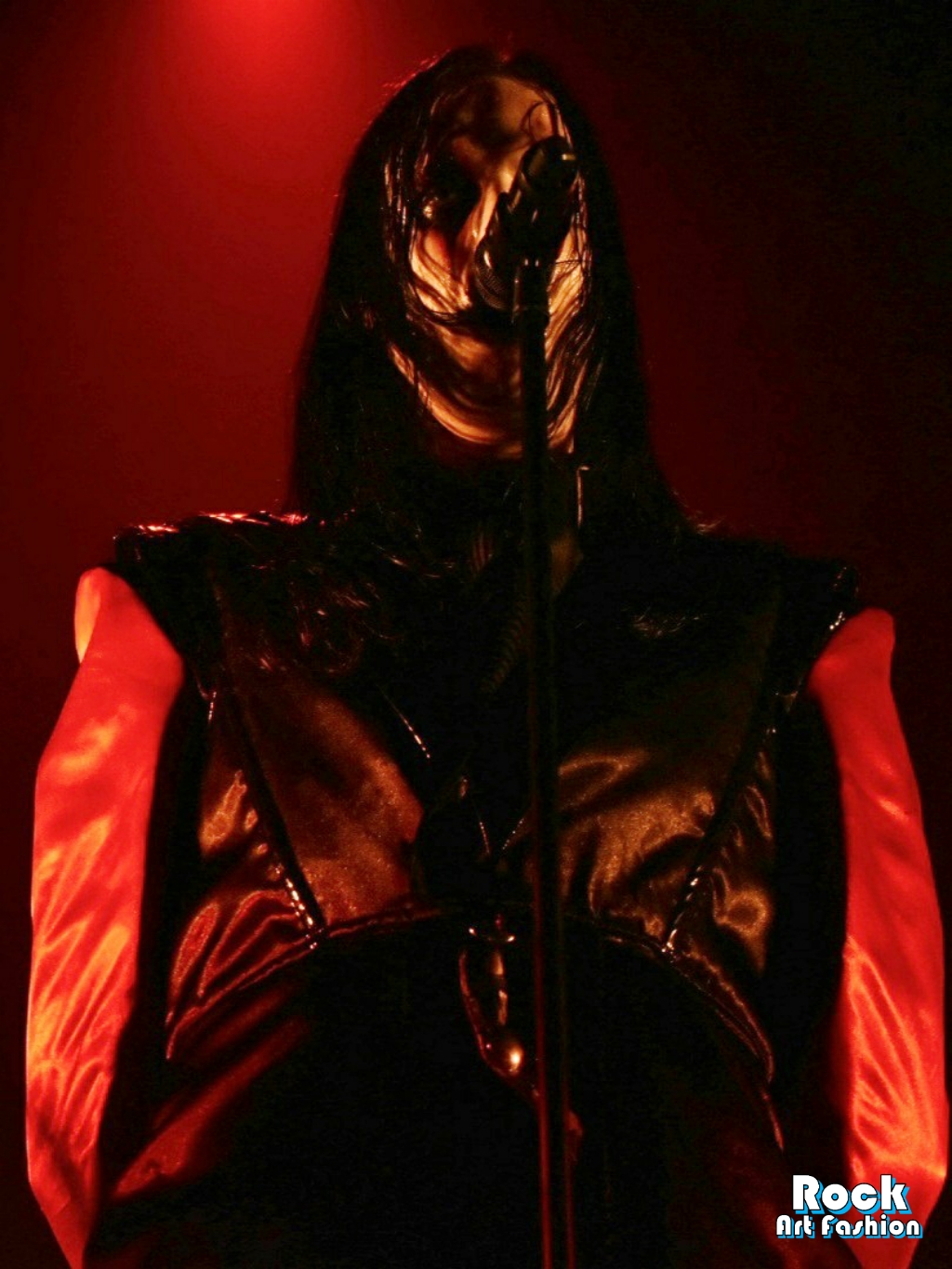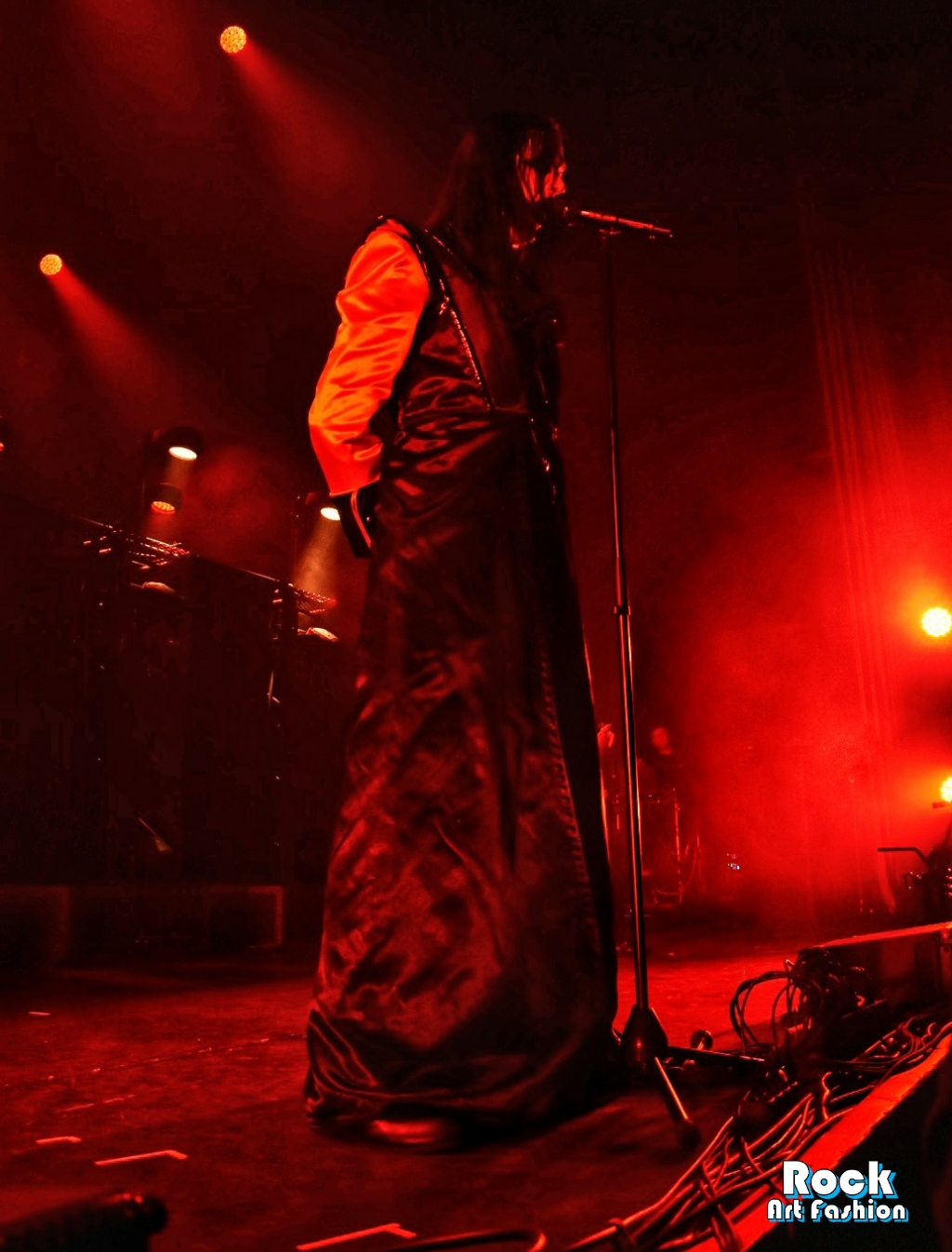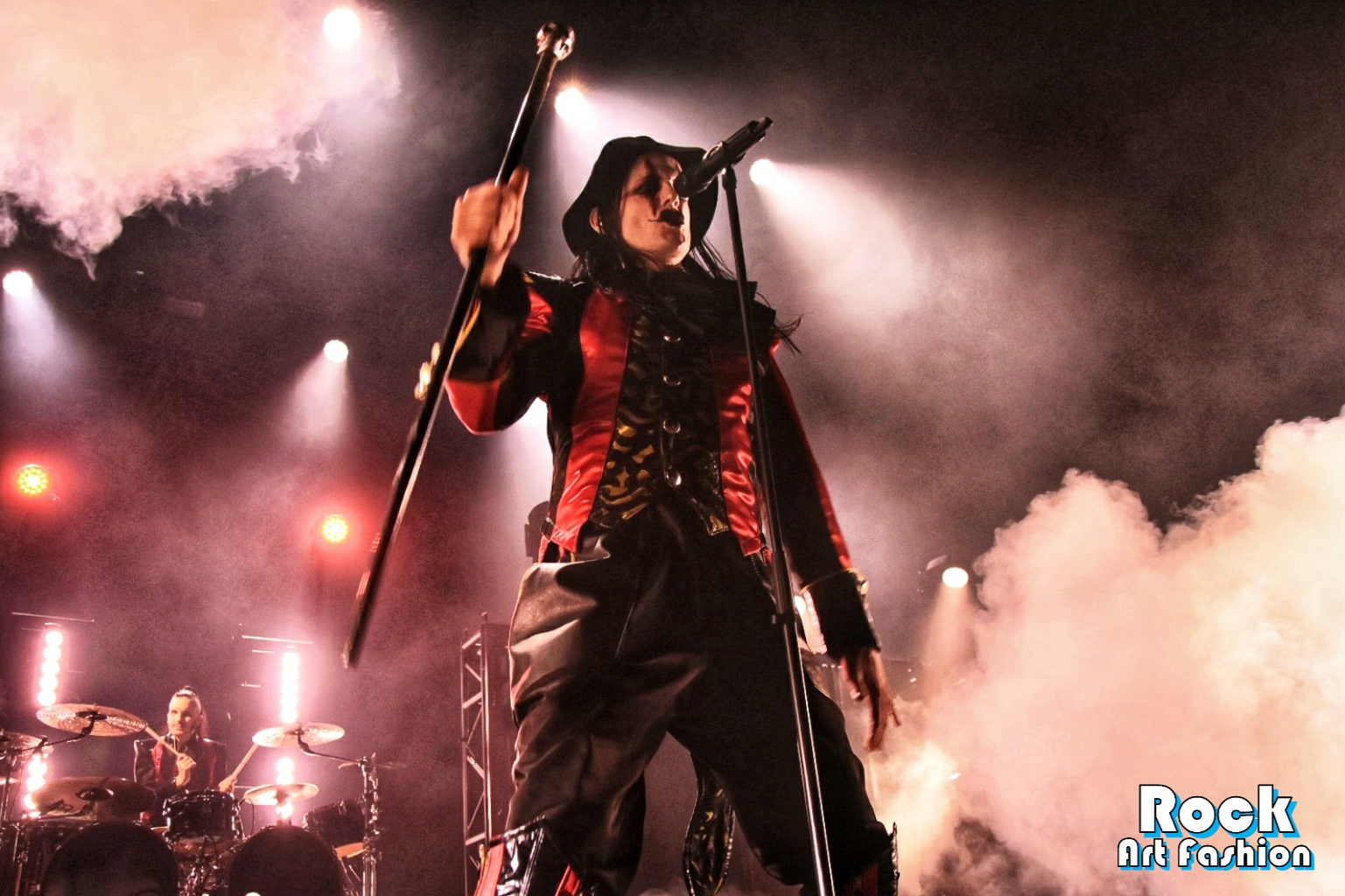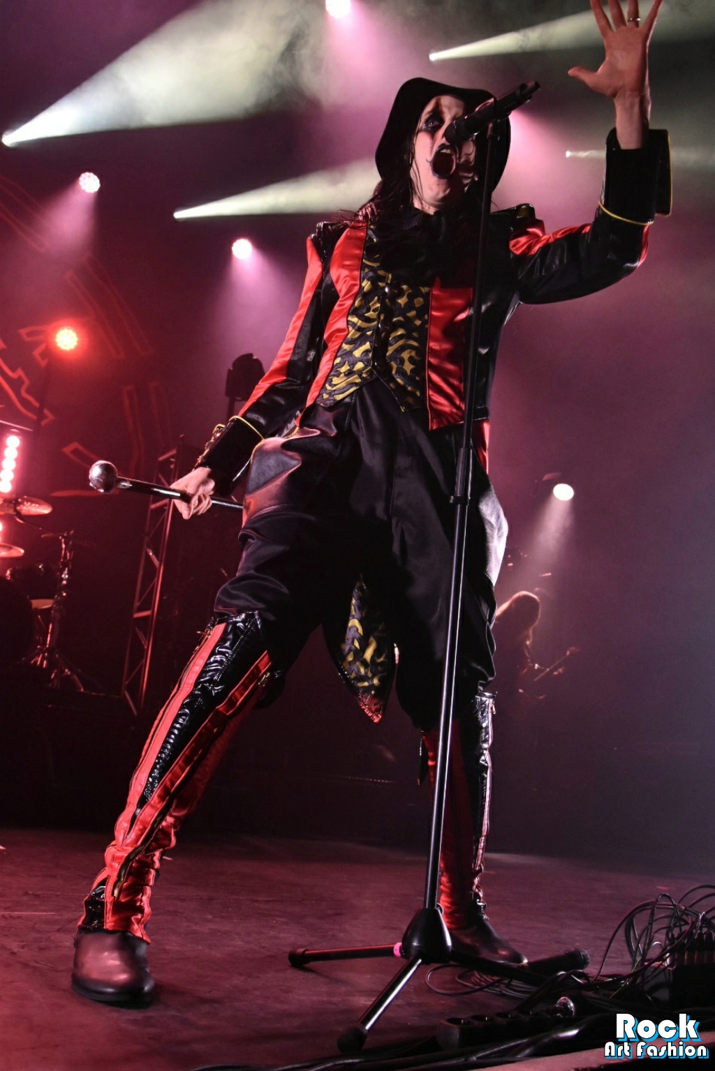 Columns of sparks appear and coordinated headbaging vortices starts. The sound is massive, the lights beautiful and the costumes fantastic. The 5 musicians all wear red and black leather and satin tunics, and black pants. Johannes Eckerström wears the most impressive tunic, a black felt hat and beautiful laced leggings. Her clownish makeup is sinister and funny at the same time, while the other members of the band wear smokey eyes.