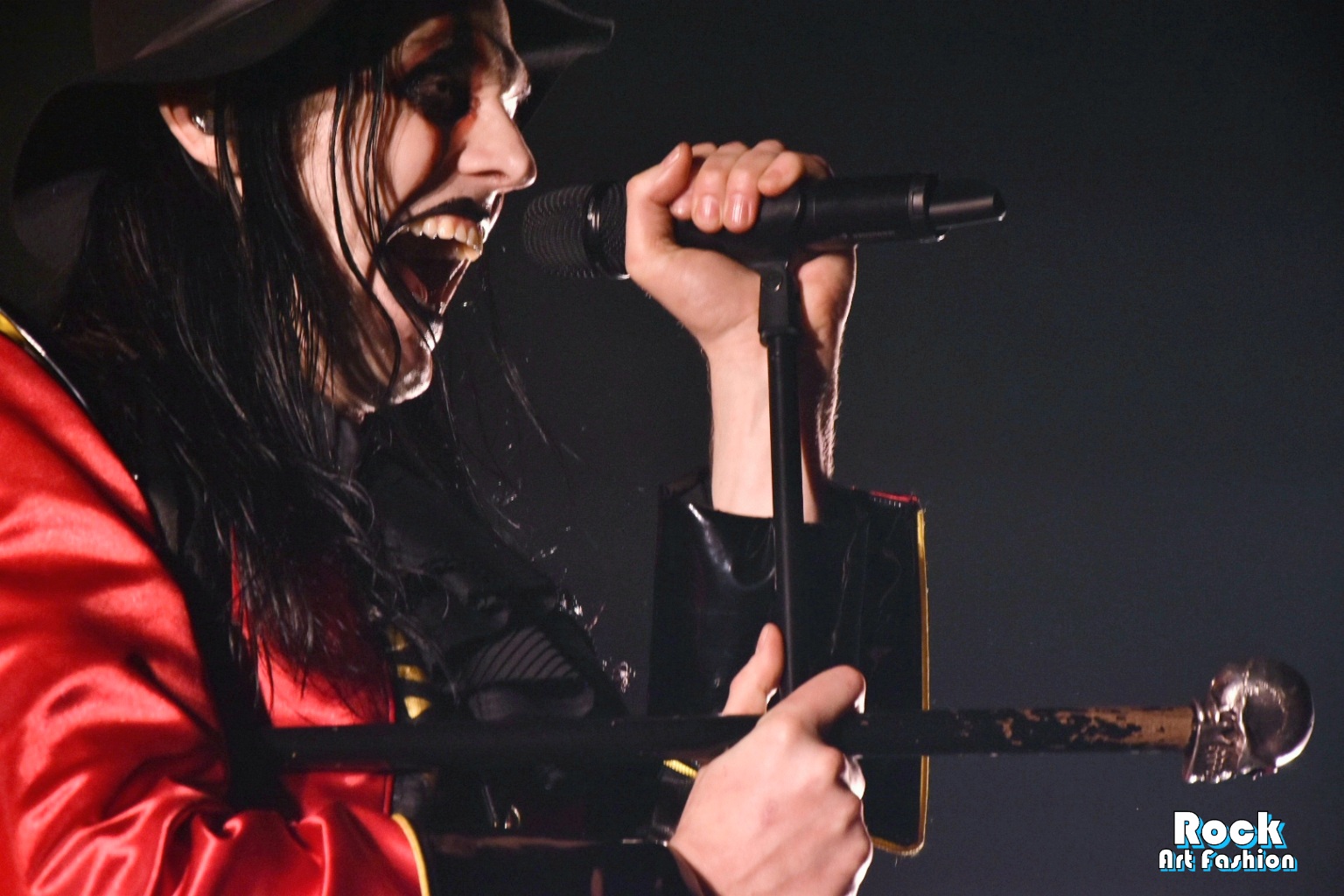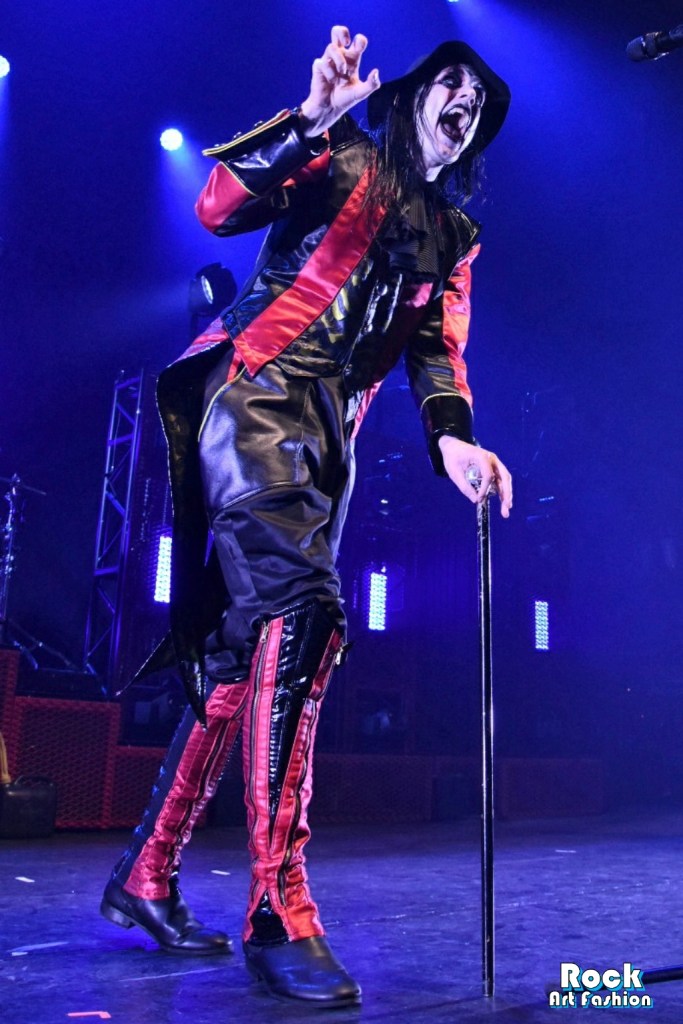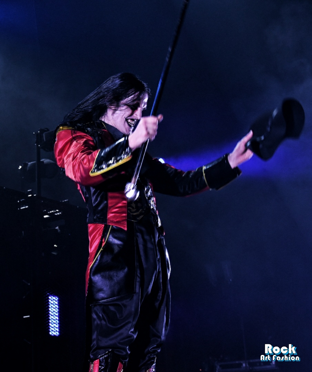 Sous des acclamations torrides, DANCE DEVIL DANCE explose et le chanteur arrive et marche vers le micro, fait de pauses, dirige avec sa canne surmontée d’un crâne argenté, jette des regards effrayants et tire la langue vers la foule.