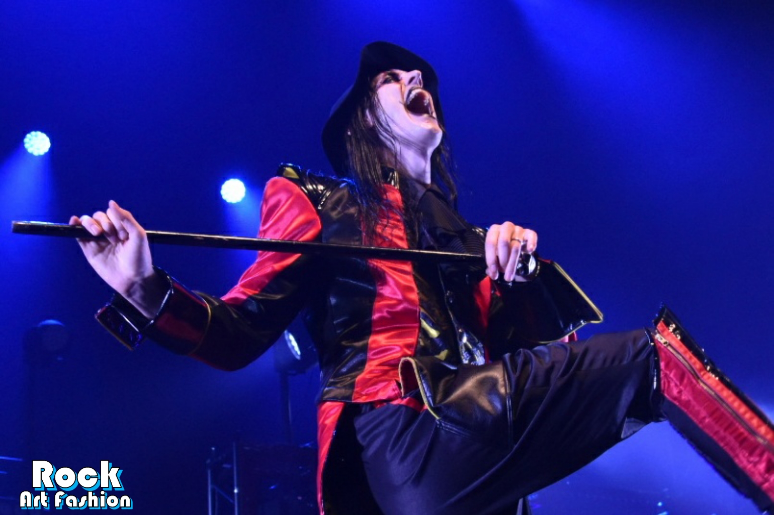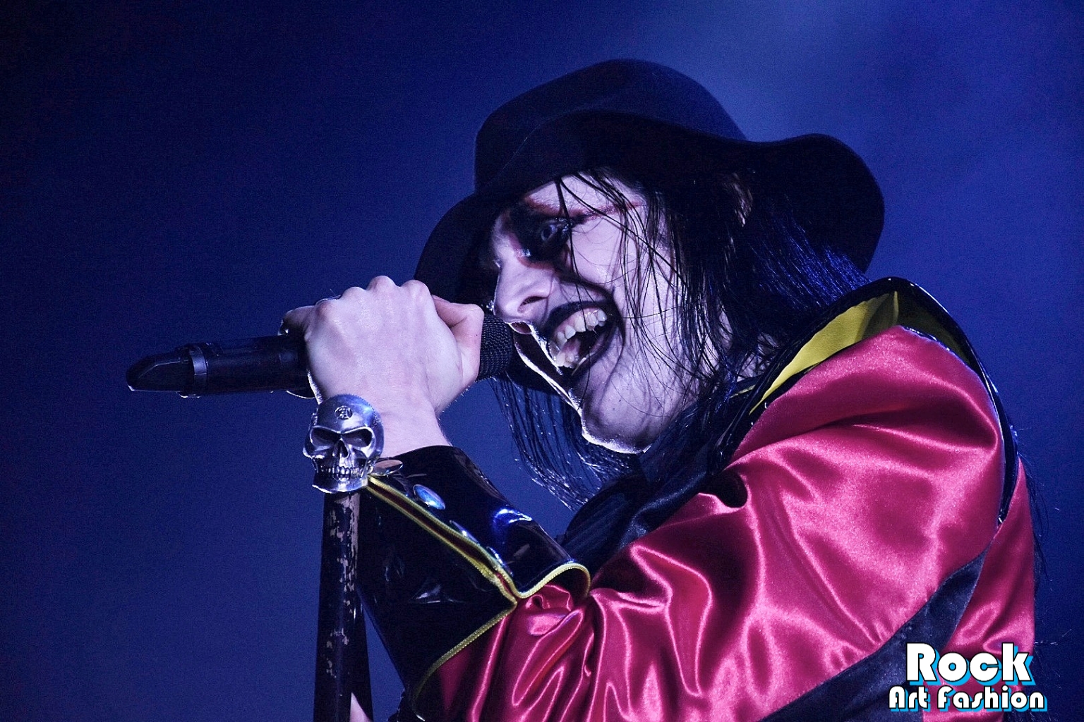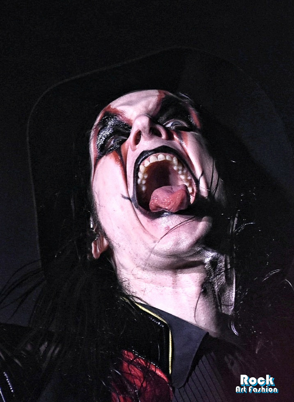 Sous des acclamations torrides, DANCE DEVIL DANCE explose et le chanteur arrive et marche vers le micro, fait de pauses, dirige avec sa canne surmontée d’un crâne argenté, jette des regards effrayants et tire la langue vers la foule.