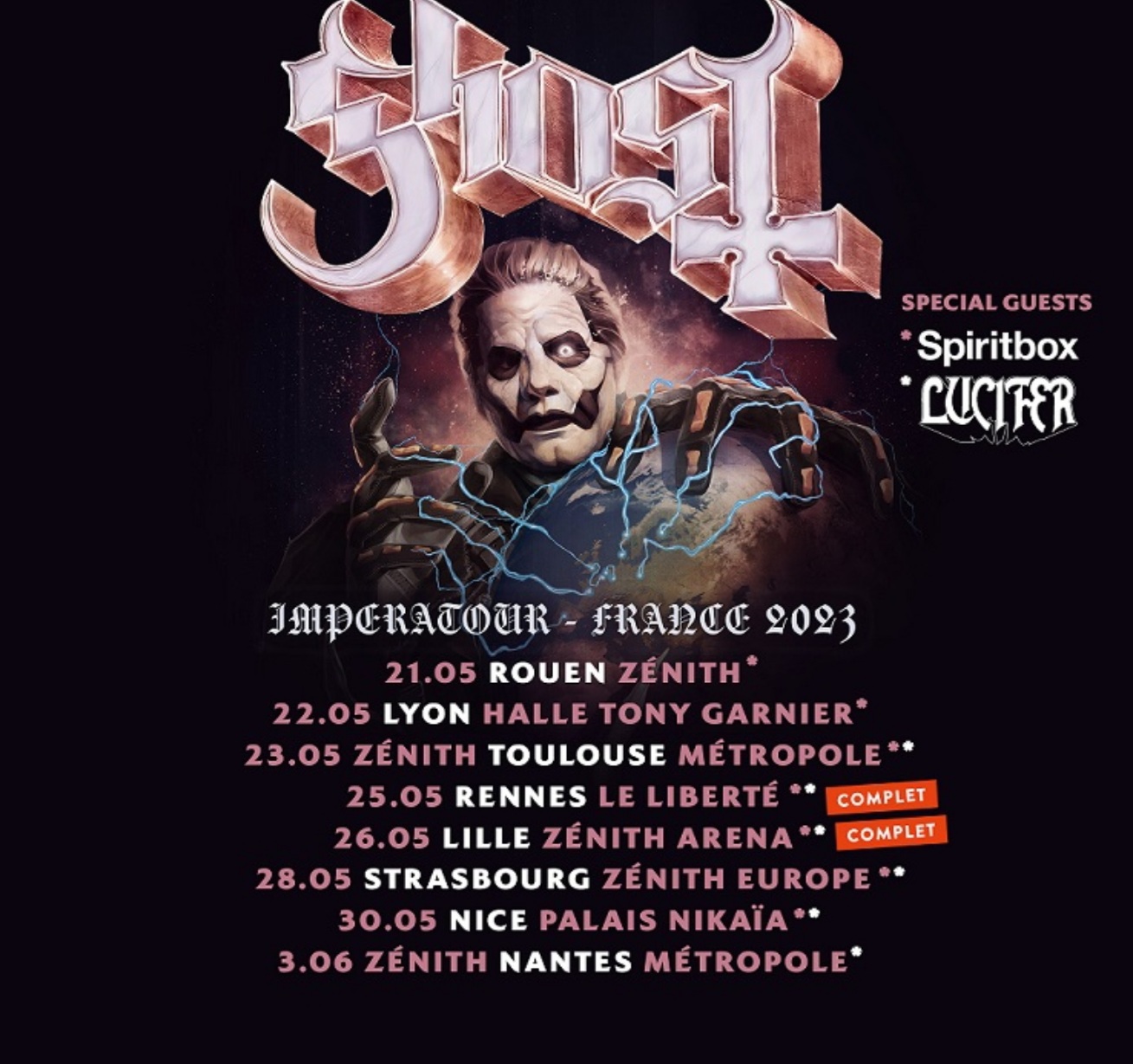 La tournée française de l’infatigable groupe GHOST commence le 21 mai – deux de 8 concerts affine déjà complet (Rennes et Lille).