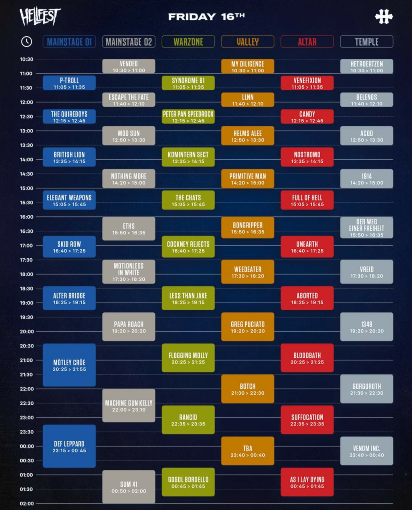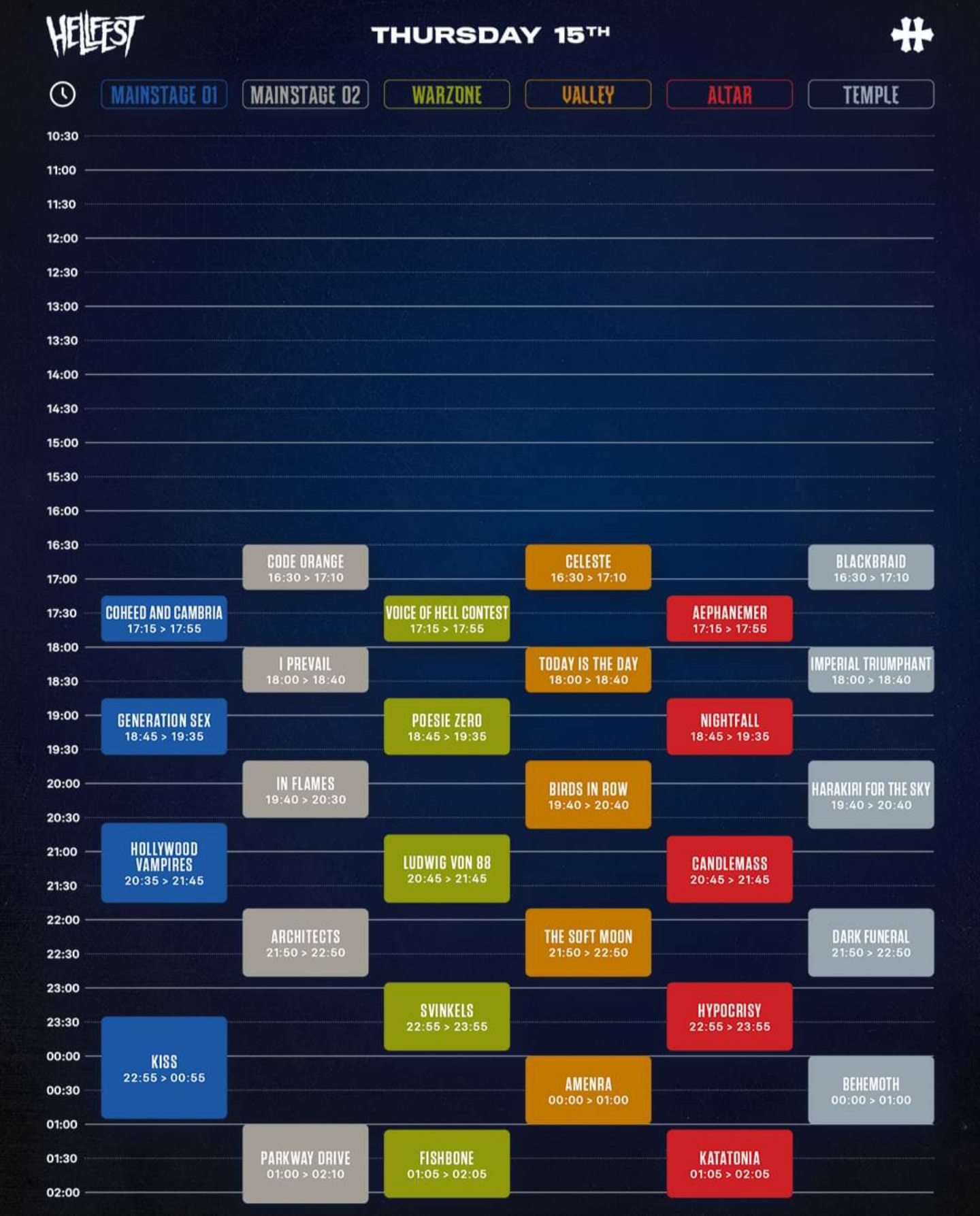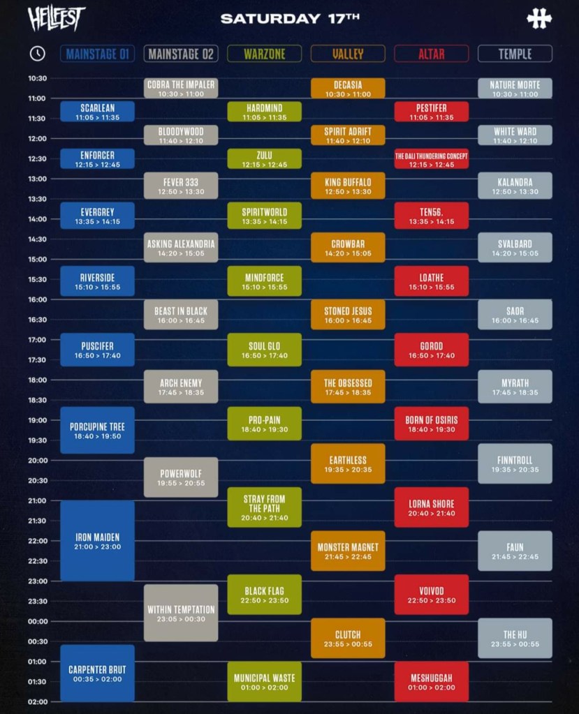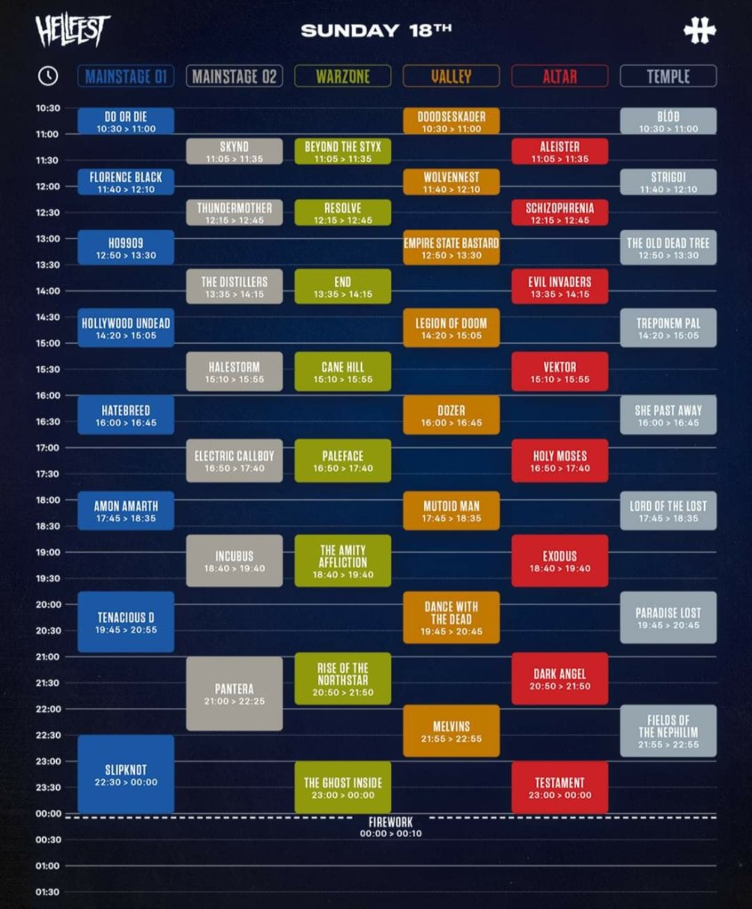 Retrouvez les horaires complètes et tous les infos sur l’app Hellfest (IOS et Android) et sur le site https://www.hellfest.fr/