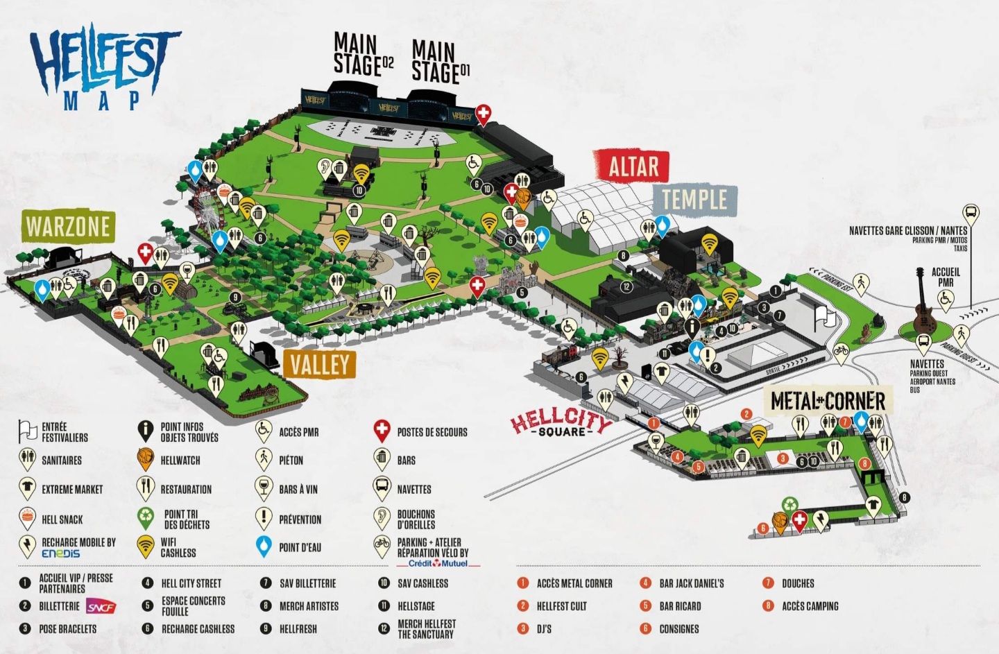 Instead of the old Merch stand, you will find 2 new bars: a cocktail bar and a juice bar (to recover strength between two concerts). The bike car park is expanding to cope with the success of two-wheeled travel with a repair workshop in case of glitches! If you come by car always the 2 large car parks available + shuttles. All the information is on the site. https://www.hellfest.fr/