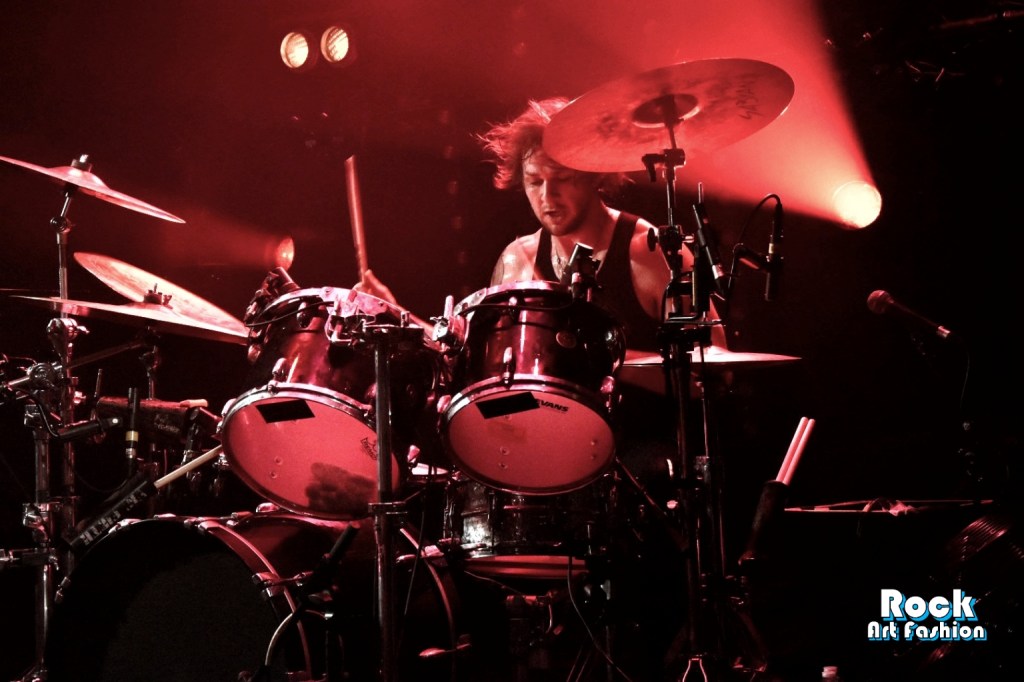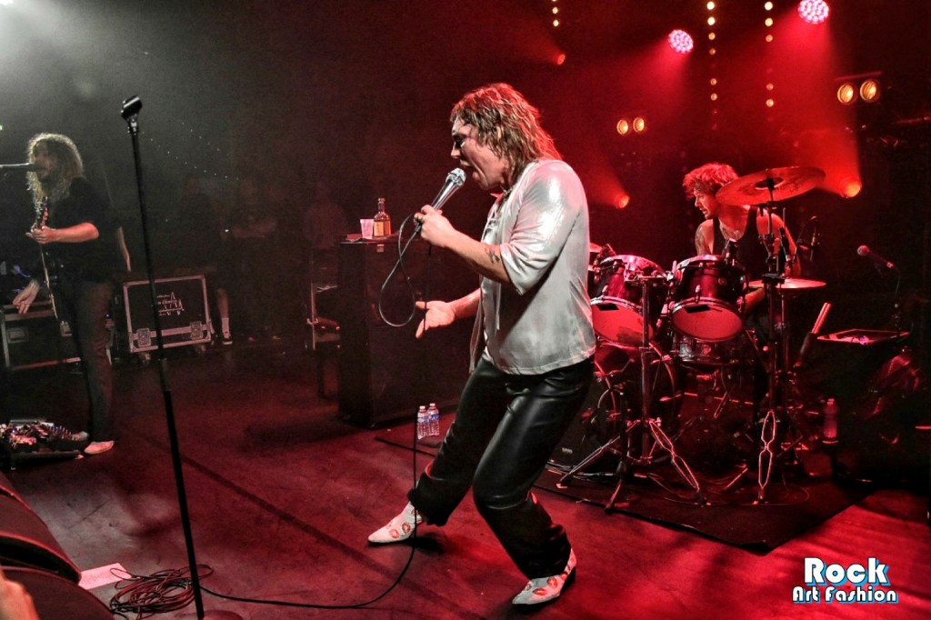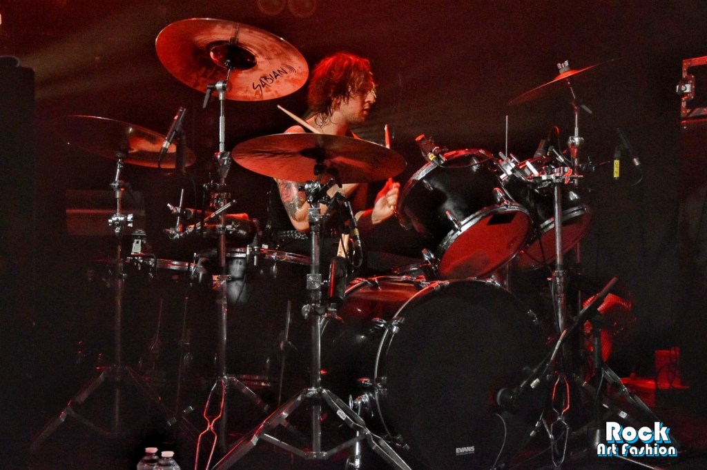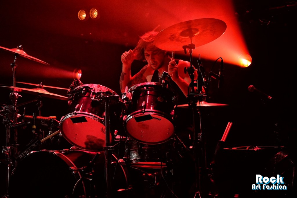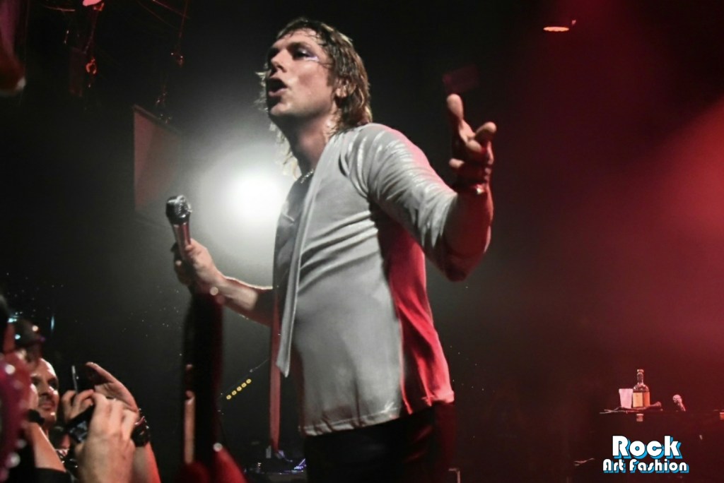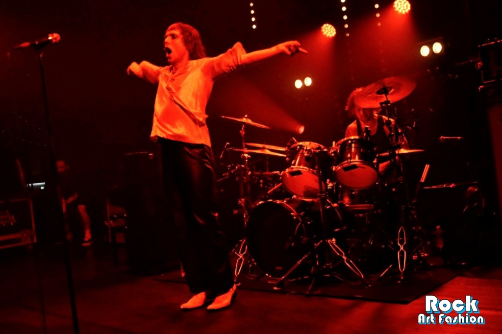 Glamour glittery makeup over the eyes, black leather pants, shiny shirt, white rock boots printed with red lips, the singer perfectly embodies the glam rock frontman. He dances, jumps, performs pirouettes, while encouraging the crowd to wave and clap their hands above their heads. He touches the hands and heads of the front rows. Adam and Jed jump and roam the stage to engage the crowd. The 3 are really close in front of the crowd, just at the edge of the stage while Geth is unleashed behind his drums brandishing his sticks.