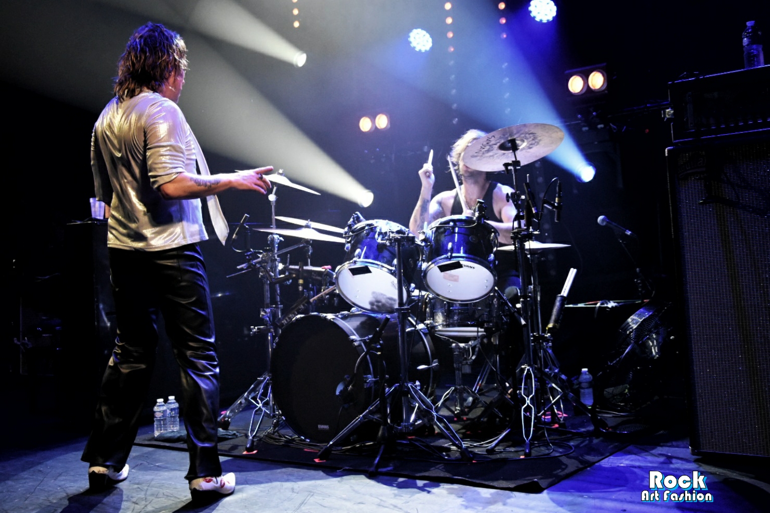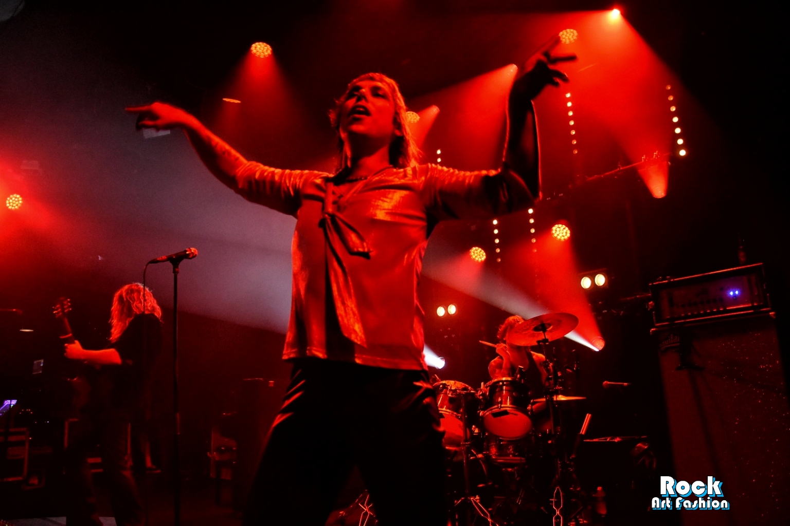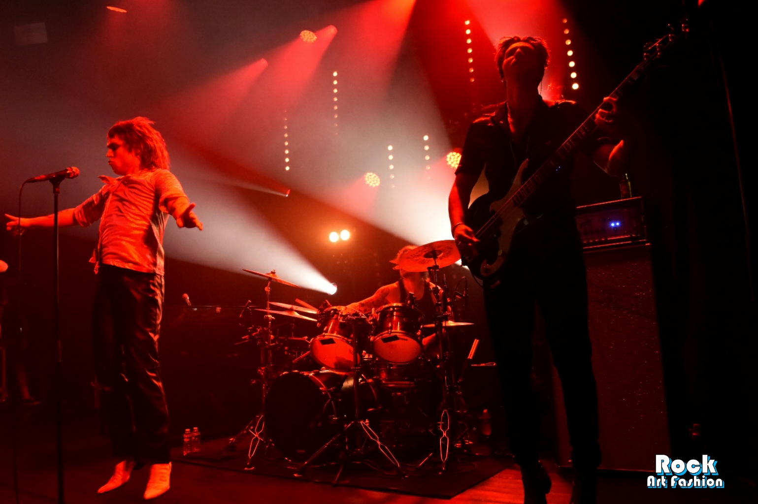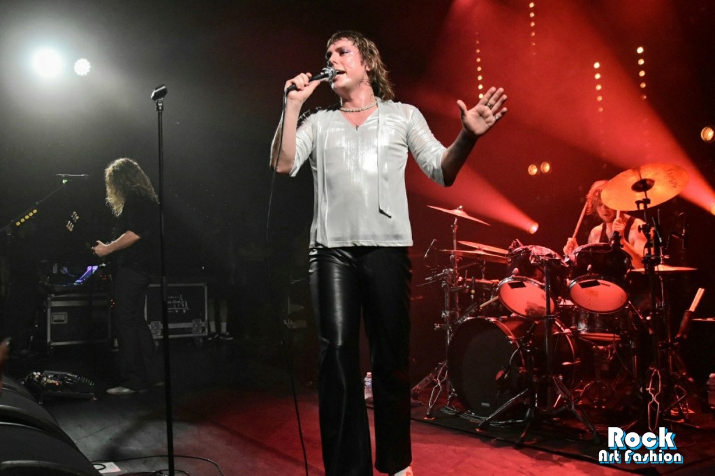 Glamour glittery makeup over the eyes, black leather pants, shiny shirt, white rock boots printed with red lips, the singer perfectly embodies the glam rock frontman. He dances, jumps, performs pirouettes, while encouraging the crowd to wave and clap their hands above their heads. He touches the hands and heads of the front rows. Adam and Jed jump and roam the stage to engage the crowd. The 3 are really close in front of the crowd, just at the edge of the stage while Geth is unleashed behind his drums brandishing his sticks.